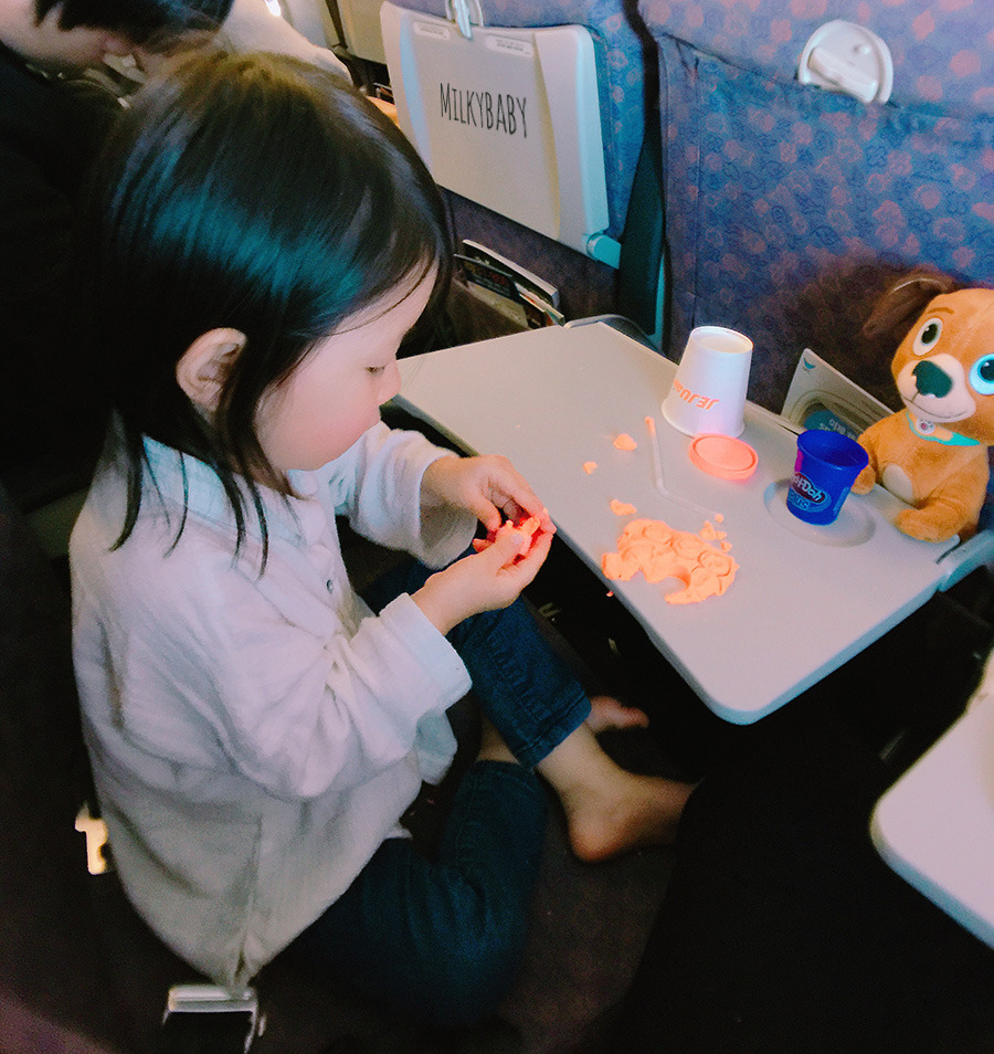 아래 글을 쓸 때보다 한 살 더 먹은 밀키. 하지만 3-4세에게 여전히 유효한 준비물입니다. 엄마에게 늘어난 준비물은 휴대용 충전기와 밀키의 간식 정도^^ 밀키는 클레이를 주물 거리다 드디어 엄마, 아빠 자리를 모두 차지하는 두 다리 쭉 뻗기를 시전하며 낮잠에 빠졌습니다! (괜찮아, 자기만 한다면!!) 이제 저도 좀 즐기려고 했는데 착륙 준비하더군요. 흑흑. 비행시간 정말 짧습니다. 대신 이동에 대한 피로도도 낮죠^^