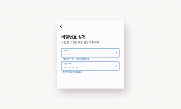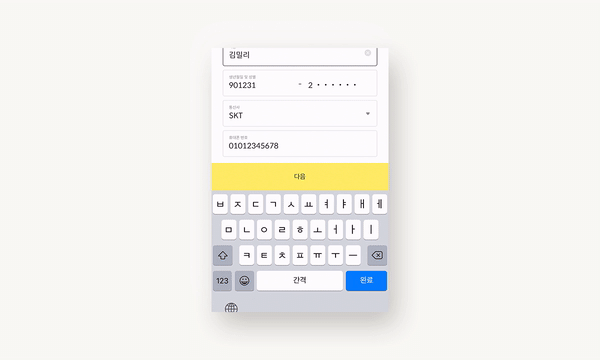 다음 필드로 넘어가기 위해 커서를 옮기거나 컨펌 버튼을 누르는 행위가 필요 없도록 했습니다. 별도의 컨펌 없이 휴대폰 번호가 모두 입력되면 다음 필드로 포커싱이 넘어가게 설계했습니다. 예외 케이스도 고려하여 휴대폰 번호의 시작이 010일 경우 11자리, 그 외 011,017,018… 일 경우에는 10자리로 입력 조건을 달리했습니다. 주민등록번호 역시 생년월일 6자리와 성별 1자리가 고정된 값이기에 휴대폰 번호와 동일한 구조로 설계했습니다. 그리고 입력 값의 변수가 있는 이름 필드를 마지막에 배치했습니다. 이제 사용자는 저희가 의도한 순서대로 입력을 한다면 필드를 옮기거나 컨펌 버튼을 클릭할 필요 없이 온전히 정보만 입력하면 됩니다.