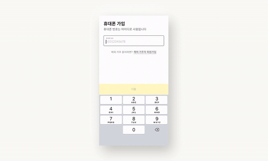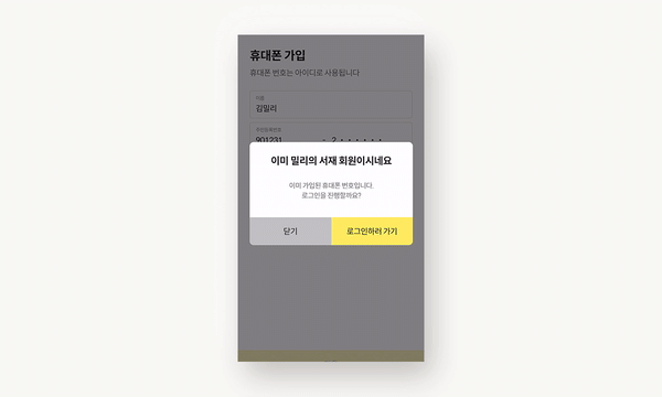 모든 사용자가 저희 의도대로 되면 좋겠지만 당연하게도 베이식한 절차에 해당하지 않는 사용자도 존재합니다. 바로 이미 가입한 회원입니다. 이들은 회원가입을 시도하지만 가입 이력이 있어 블락당하게 됩니다. 여기서 안내를 그치면 사용자는 로그인할 수 있는 경로를 직접 찾아 나서야 합니다. 저희는 그런 불필요한 과정을 단숨에 건너뛸 수 있도록 로그인 화면으로 바로 가는 버튼을 제공했습니다. 거기다 회원가입을 시도한 휴대폰 번호(아이디)를 미리 입력해둔 채로 비밀번호 필드에 포커싱을 해줍니다. 귀찮은 일은 저희가 다 했고 사용자는 비밀번호만 입력하면 됩니다.