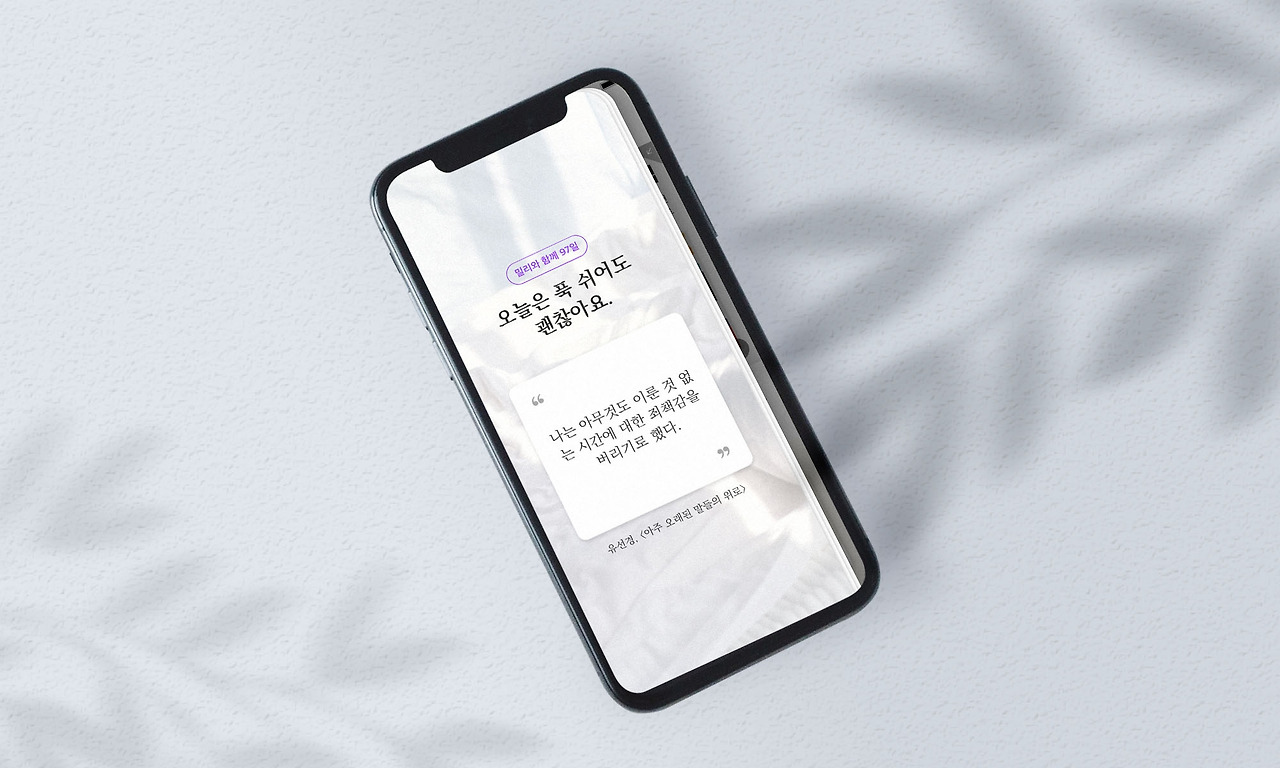 홈 커버의 역할을 극대화하기 위해 종이가 여러 장 겹쳐있는 듯한 그래픽과 명조체를 활용하여 실제 책의 느낌을 살리려고 노력했습니다. 따뜻하고 포근한 느낌을 주되 시선을 뺏지 않는 잔잔한 이미지를 배경으로 사용하였으며, 회원에게 말을 거는 듯한 문구를 상단에 가장 크게 배치하여 시선을 끌었습니다. 박스 형태와 큰 따옴표를 이용해 가독성 높은 인용문을 제공하였습니다.