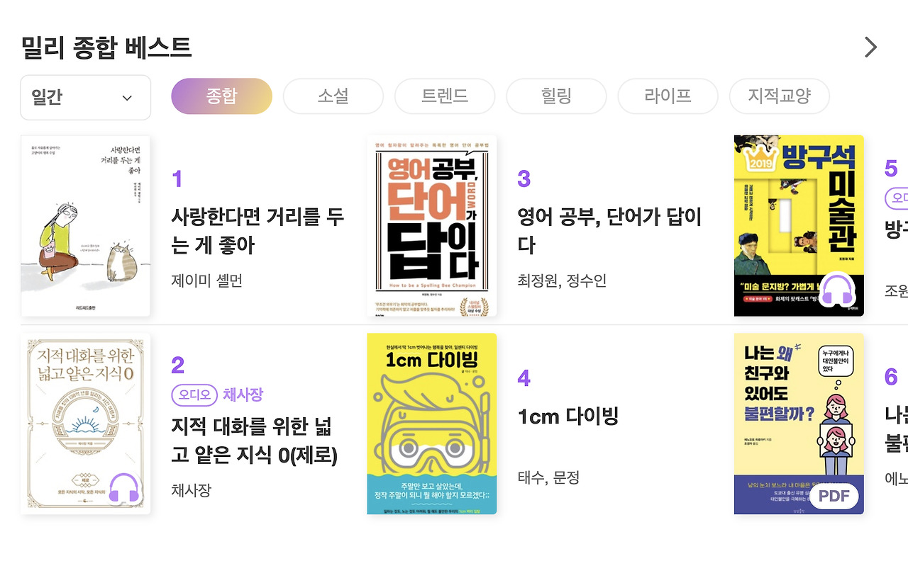 이제는 홈 커버가 흥행 보증 수표로 자리 잡았습니다. 홈 커버에 노출된 책이 밀리 종합 베스트에 자주 등장하기 때문입니다. 제이미 셸먼, <사랑한다면 거리를 두는 게 좋아>의 경우에는 홈 커버에 노출된 다음 날 밀리 종합 베스트 일간 1위를 달성하였습니다.