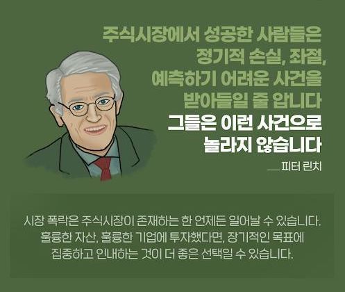 '당신이 주식시장에서 알아야 하는 것은 두렵고 걱정되는 일들이 항상 일어난다는 것입니다. 당신이 해야 할 일은 이런 걱정들을 다 내려놓고 좋은 기업을 보유하고 좋아지는 기업을 공부하는 것입니다. 그렇게 한다면 투자에 성공을 할 것입니다.'