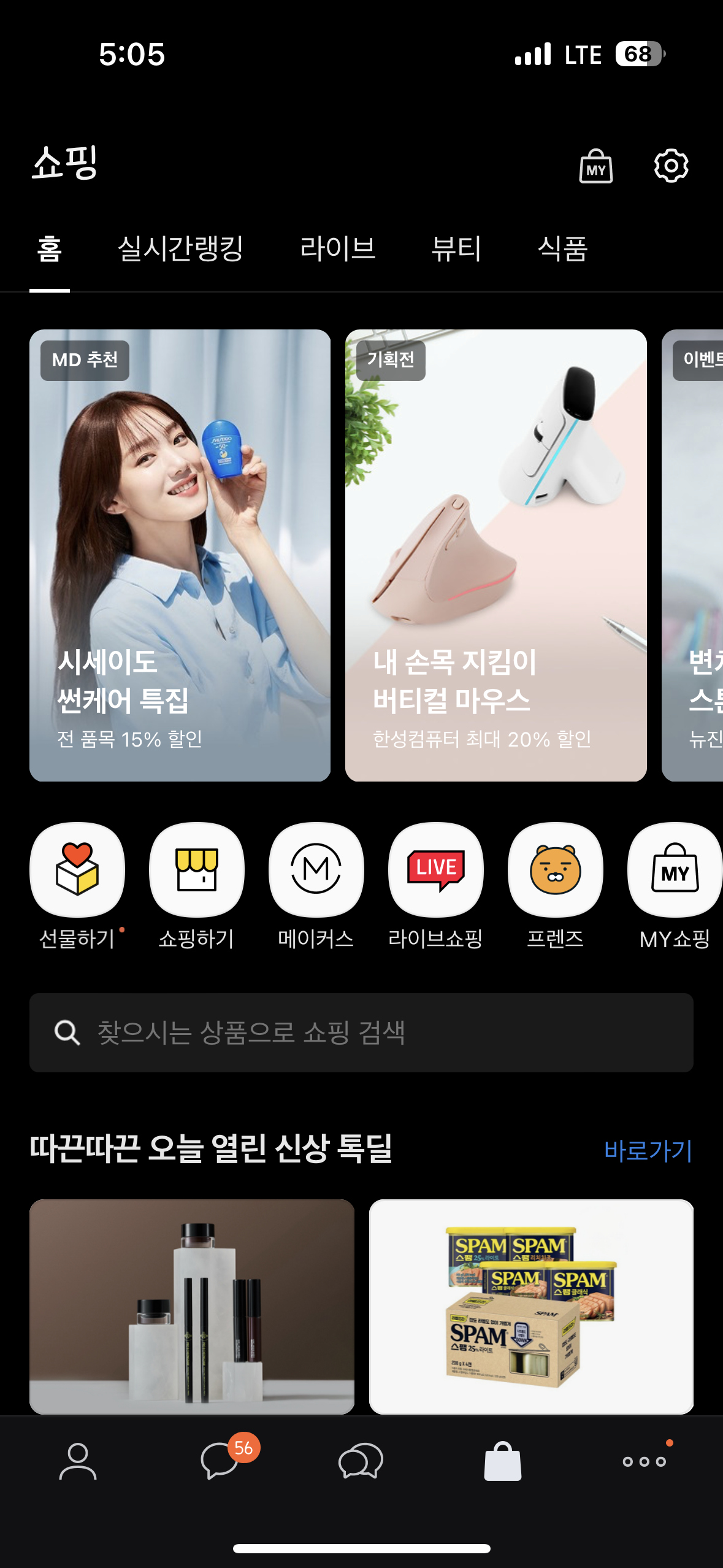 메인화면 : 선물하기 - 쇼핑하기 - 메이커스 - 라이브쇼핑 - 프렌즈 - MY쇼핑