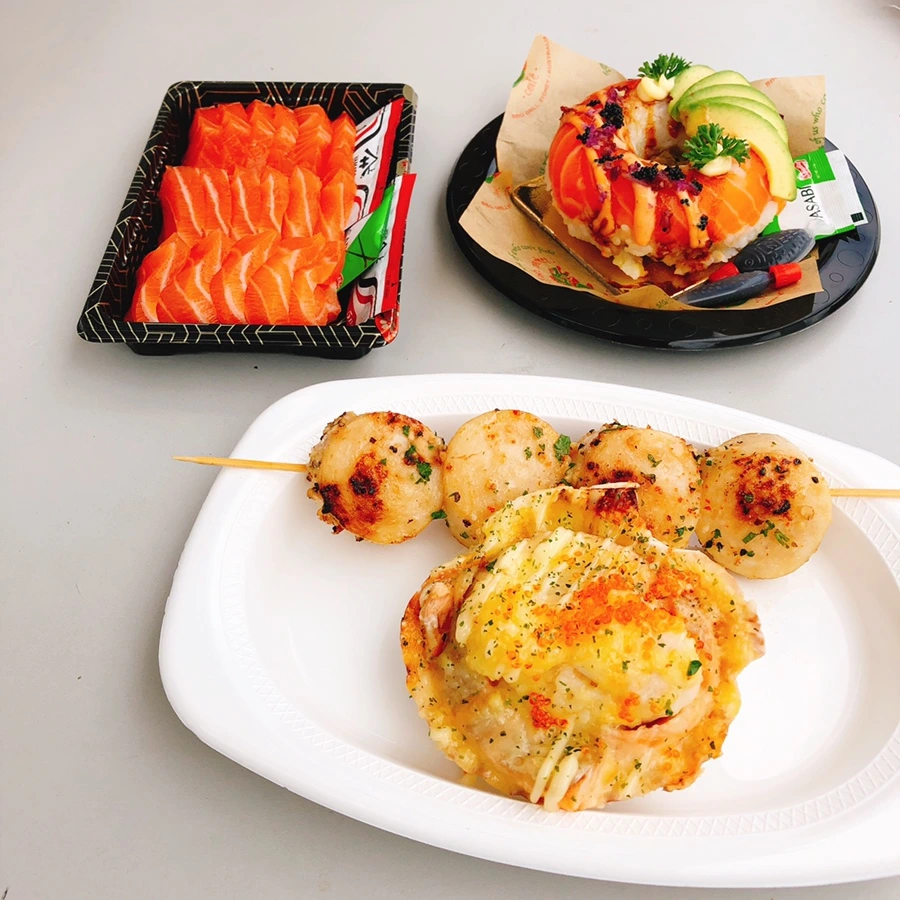 이곳저곳 바쁘게 구경하면서 뭘 먹을까 갈등하다가, 어렵게 어렵게 선정한 이 날의 점심 메뉴! 귀여운 스시도넛과 신선한 연어회, 가리비 치즈구이와 관자꼬치까지! 하나하나 소중히 골라서, 안쪽에는 마땅히 먹을 자리가 없길래 바깥쪽 자리로 나와서 자리를 물색했다.