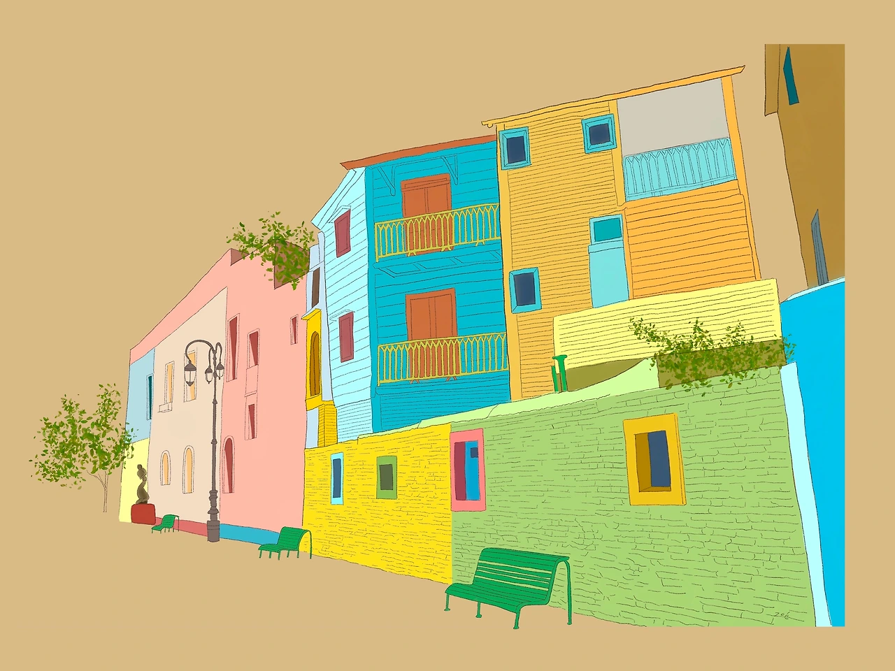 건물들은 모두 형형색색이다. 이러한 모습도 부두 노동자들이 배에 칠하고 남은 페인트를 가져다 가난의 흔적을 가리기 위해 칠하면서 시작되었다고 한다. 건물들 자체도 시멘트 벽이나 양철지붕 등 고풍스러운 건축물들과는 거리가 멀다. 그럼에도 열심히 살았던 그들의 흔적이 고스란히 느껴져 정감 있고 따뜻하다.