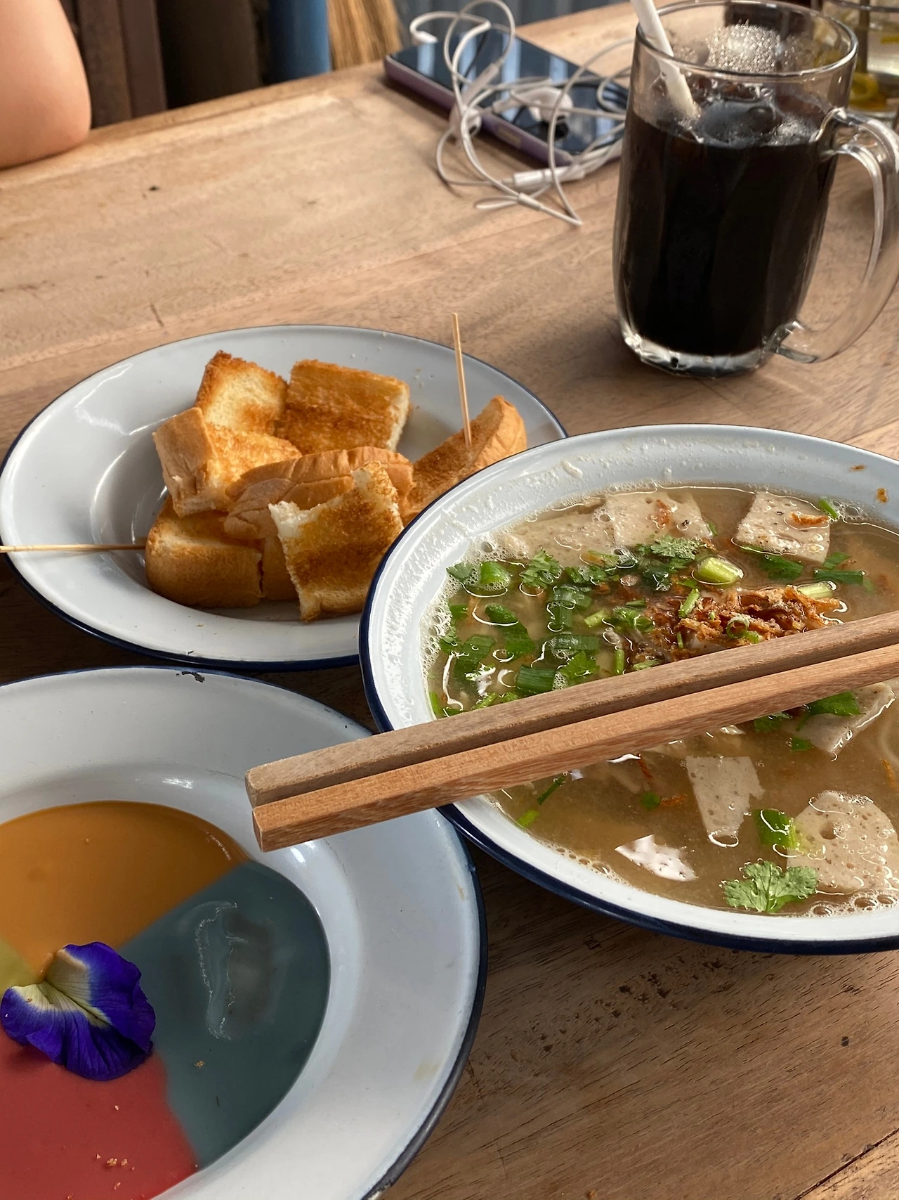 한날은 그런 생각이 들었다. 하이에나로 치앙마이를 머물다 가면 안 되겠다는 생각. 엄연히 우리는 사람이 아닌가. 이제는 여행하는 인간이 되어보자. 고기가 들어가지 않은 음식을 찾아보기로 말이다. 그래서 눈과 입을 사로잡는 맛이 있다던, 여행자들에게 유명한 ‘꼬프악꼬담’을 가기로 했다. 꼬프악꼬담은 4색의 커스터드 크림과 토스트 세트가 유명한 곳이다. 블로그를 찾아보니, 분홍색, 주황색, 하늘색, 연두색으로 된 4가지 색의 커스터드 크림이 아니나 다를까, 나를 사로잡았다. 여긴 가야 해! 치앙마이를 기억할 수 있는 맛집 한두 군데는 남겨둬야 하지 않겠어?라는 마음으로 서영이와 함께 가기로 결정했다. 블로그를 찾아본 순간부터, 커스터드 크림이 너무 예뻐서 기대가 잔뜩 되던 곳이었다. 게다가 국수 맛집이라던데, 면을 좋아하는 나로서는 환상의 장소였다.