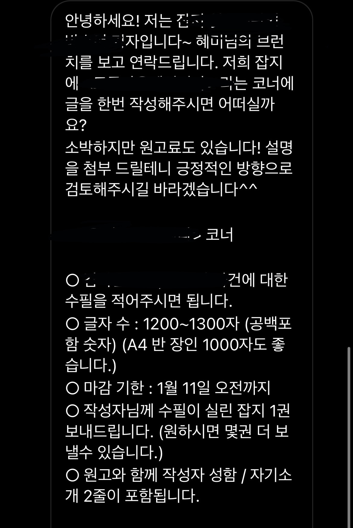 - 모잡지 의 000 기자입니다. 저희 잡지 <000> 코너에 글을 한 번 작성해 주시면 어떨까요?
