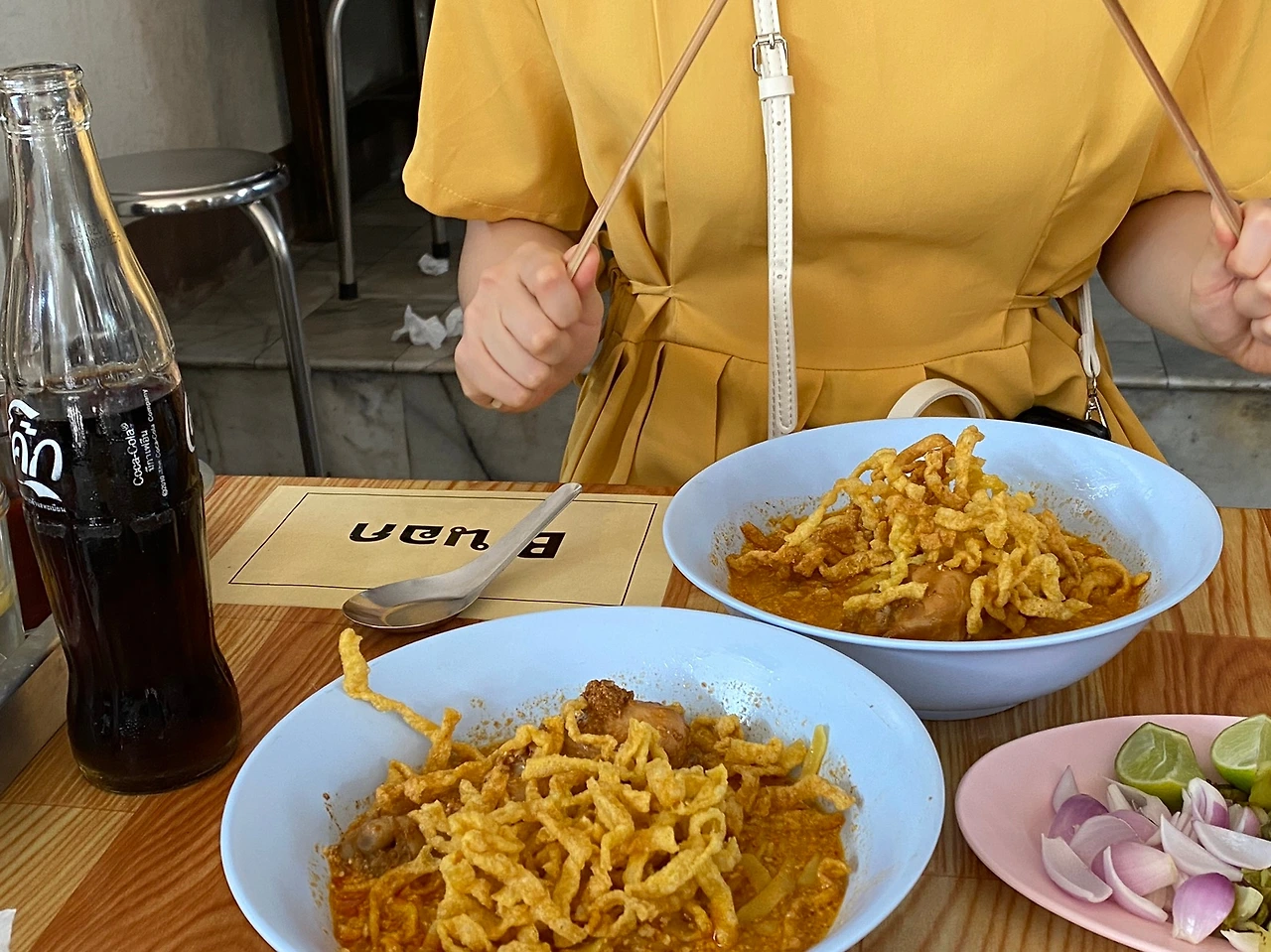 그리고 힘차게 카오 소이 카이 두 개와 콜라를 주문한다. 카오 소이 카이는 코코넛 밀크와 카레가 국물로 되어있는 닭다리가 들어가 있는 면요리다. 이게 그렇게 맛있어?라고 물어본다면 당연히 YES다. 이유는 다음과 같다. 편식쟁이. 초딩입맛. 모두 나를 가리키는 수식어로. 이 나이 먹고 편식을 한다는 것이 조금 부끄럽긴 하지만 어쩌겠는가. 야채와 낯선 음식은 도저히 먹으래야 먹을 수가 없다. 몇 입 먹기만 해도 헛구역질을 해대는 탓이다.