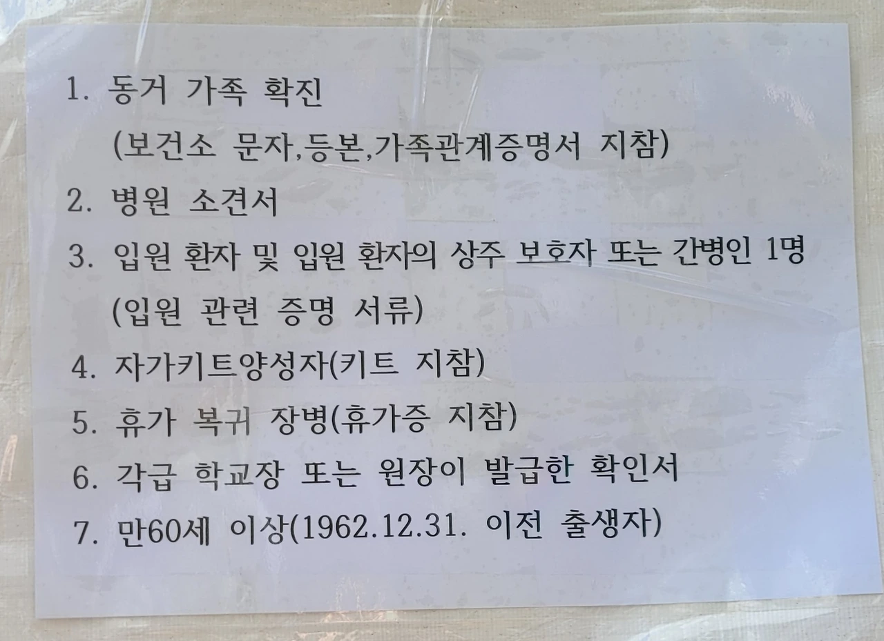 * 동거인 확진으로 PCR 검사를 받으러 갈 때는 가족임을 증명할 수 있는 서류 지참(주민등록등본 등)