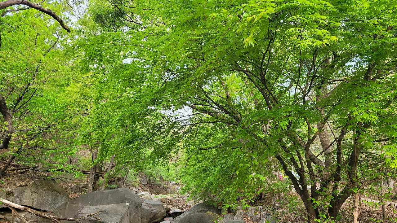 긴 기다림 끝에 연분홍 철쭉을 만나고 초록으로 물든 산을 기쁜 마음으로 오른다. 이른 아침 6시, 온전하게 나에게 집중하는 시간이다. 계곡을 꽉 채운 초록나무를 보며 나도 모르게 그곳으로 향한다. 나무 그늘 아래서 쉬고 싶은 강한 유혹을 뿌리치기 힘들다. 한여름의 뜨거운 햇살 아래서도 시원한 바람을 선물해 줄 거 같다.