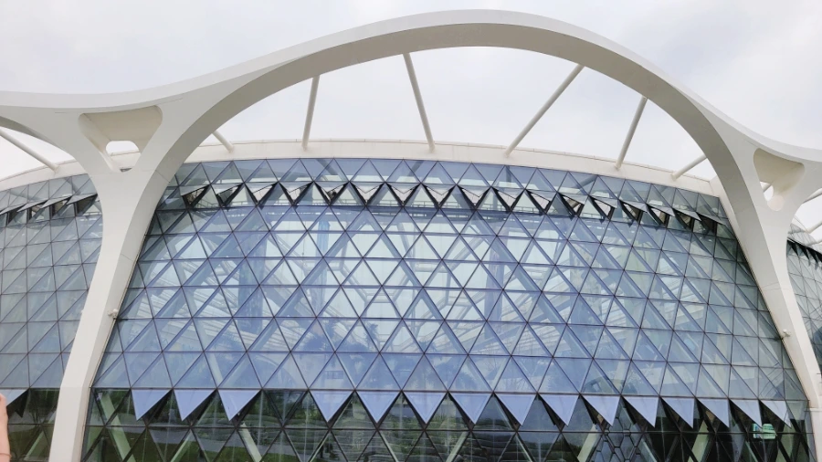 오목한 접시 모양으로 생긴 온실 모습, 독특한 모양입니다.