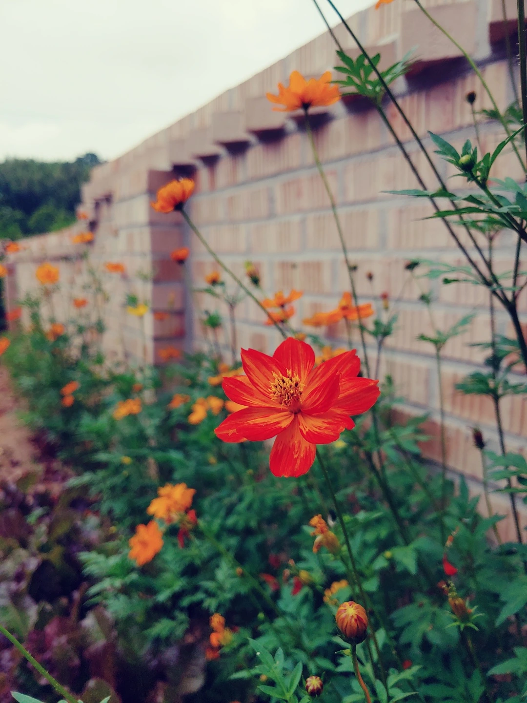 긴 담장을 따라 나란히 피어있는 꽃들이 싱그럽습니다.