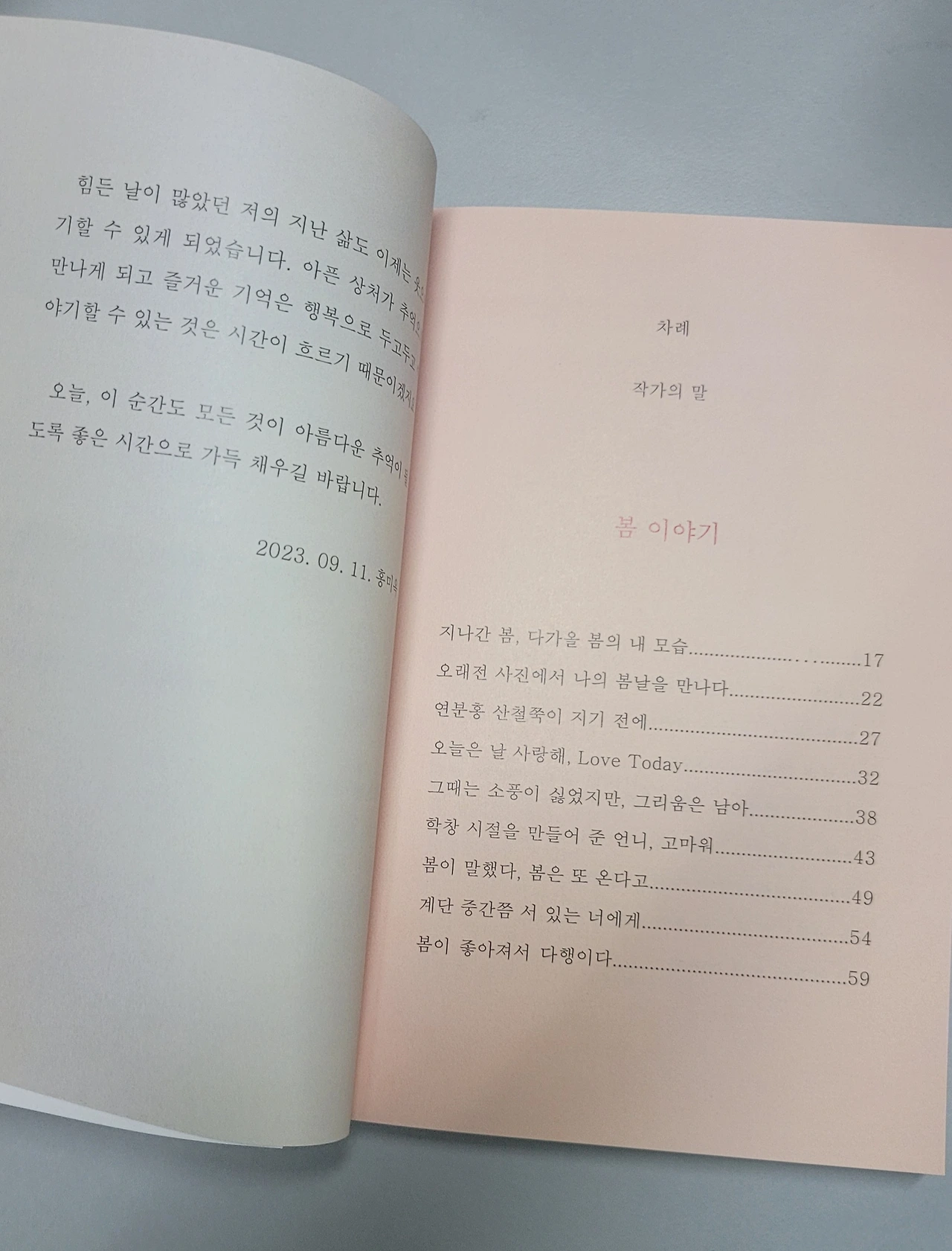 글을 쓰면서 책 쓰기 도전을 하고 실제로 책이 출판되었다. 책을 출간해야겠다는 생각도 계획도 없던 일이었지만 어느새 글이 책이 되어 나오게 되었다. 계획하지 않은 일이라 어쩌면 더 쉽게 진행되었는지도 모르겠다. 내 이름이 적힌 책이 세상에 나왔지만 책 한 권 출판했다고 일상에 큰 변화가 생기지는 않았다. 그저 평소대로 평온하게 변함없는 시간이 이어졌다.