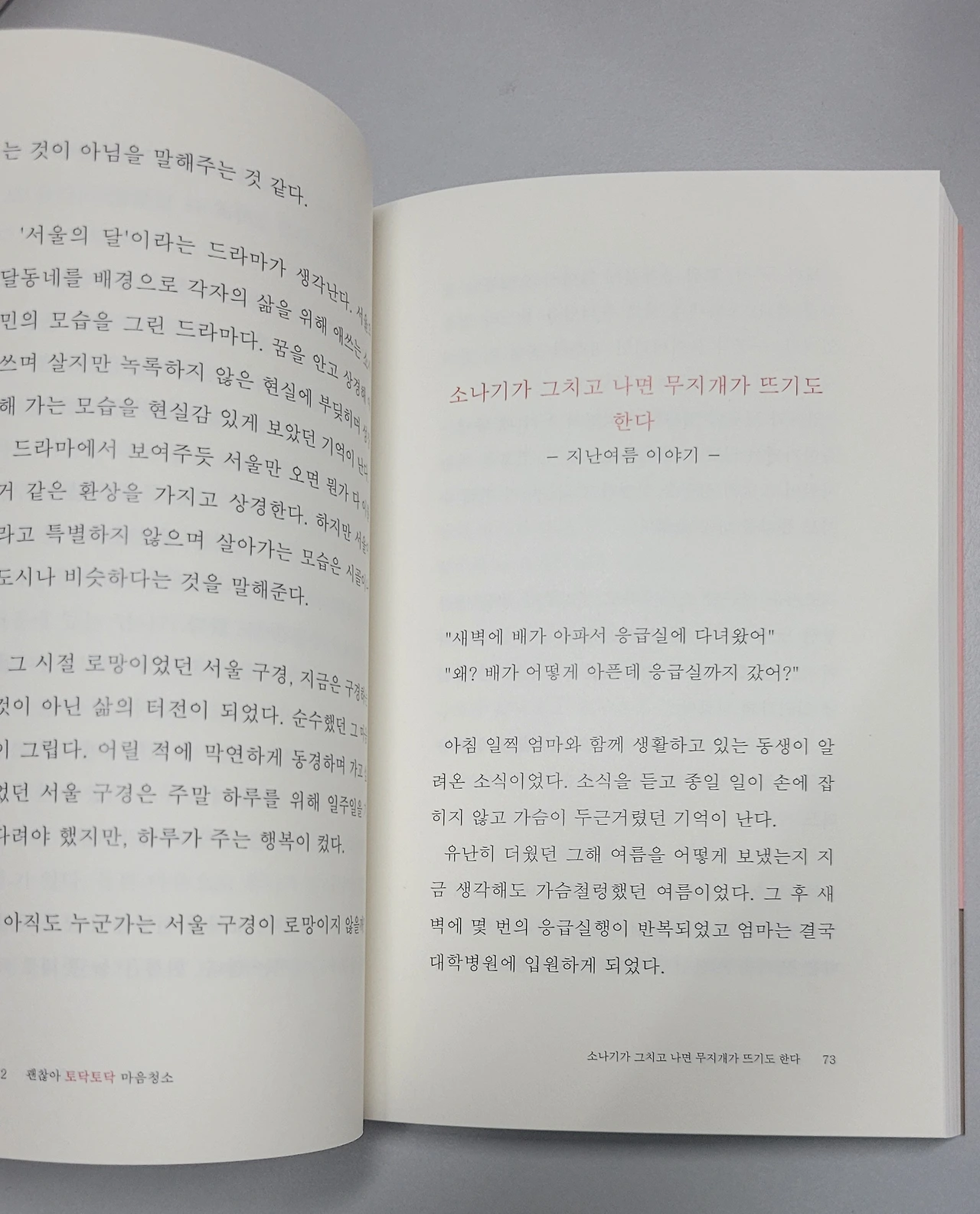 고된 시간을 보내고 결국 종이책을 출간하였다. 1인출판사 '도서출판 단미'의 이름으로 종이책이 출간된 것이다. 비록 내가 글을 쓰고 내가 출판하는 일이라 해도 그 과정은 쉬운 일은 아니었다. 아무것도 모르는 상태에서 하나부터 열까지 공부하면서 이루어낸 성과이기에 더 큰 의미가 있다. 무모한 도전이었지만 결국 종이책 출판을 성공했다. 책 제목은 《괜찮아 토닥토닥 마음청소》이다. 일상에 지친 마음에 위로가 되었으면 하는 마음을 담았다. 누군가에게 작은 위로가 되기를 바란다.