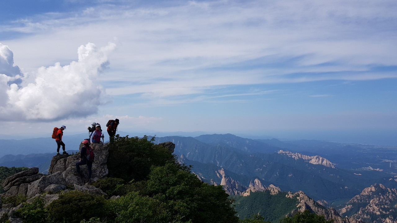 아침 6시 출발, 설악에 도착하니 정말 예쁜 하늘이 반겼다. 높고 푸르고 맑은 하늘을 보는 것만으로도 들뜨고 기분이 좋았다. 준비를 하고 오르기 시작했다. 푸르름 가득한 우거진 숲길은 상쾌하고 시원함을 안겨주었다. 오르는 동안 계곡의 물소리를 들으며 걷는 것도 좋았다.