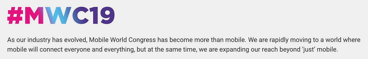 MWC는 모바일 월드 콩그레스(Mobile World Congress)의 약자로 공식행사명은 모바일 월드 콩그레스였습니다. 흥미롭게도 올해 2019년부터는 공식 행사명을 모바일 월드 콩그레스의 약자인 MWC로 변경했습니다. 행사 주최 측의 공식행사명의 변경 결정은 정보통신기술이 더 이상 '모바일(Mobile)'에만 한정되지 않는 시대상을 반영하고 있습니다. 이전에는 '모바일' 자체가 세상의 변화를 이끄는 새로운 기술의 결정체였다면 MWC2019의 화두가 됐던 '5G 시대'에 모바일이란 단어는 이미 너무 보편화되었기 때문이 아닐까 생각합니다.