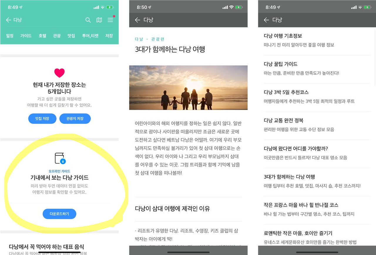 미리 다운로드하여서 핸드폰에 저장해두면 인터넷 걱정, 배터리 걱정 없이 읽어볼 수 있습니다. 구성도 쫀쫀하고 가독성도 좋습니다. 제법 무게가 나가는 가이드북보다는 훨씬 휴대성도 좋죠. 이후 저는 주변 사람들이 여행 간다고 할 때 빼놓지 않고 이 기능을 알려줍니다. (어느 정도 주기로 업데이트되는지는 모르겠습니다만, 뭐 한번 간 여행지를 아주 짧은 주기로 다시 방문하는 사람은 잘 없을 테니까요.)