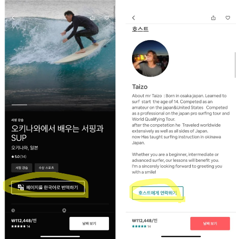 액티비티 상세 페이지로 들어온 사용자에게 이 페이지를 원하는 언어로 번역해서 볼 수 있다고 알려주는 것만으로도 이탈을 막을 수 있습니다(좌측 노란 동그라미). 에어비앤비 특유의 고객 경험인 '호스트에게 연락하기' 기능(우측 노란 동그라미)은 액티비티에서도 제공됩니다. 낯선 곳을 방문하는 여행자라면 당연히 호스트에게 이것저것 묻고, 자신의 선택에 대한 확신을 얻고 싶습니다. 게다가 앱 상에서의 대화라도 일단 호스트와 1:1 대화를 하고 나면 마치 상대방과 이미 아는 사이가 된 것 같은 느낌이 듭니다. 당연히 예약할 확률은 높아지겠죠. 생에 한 번 방문하는 여행지에서의 소중한 경험을 망치고 싶지 않은 마음을 간파한, 똑똑한 장치입니다.