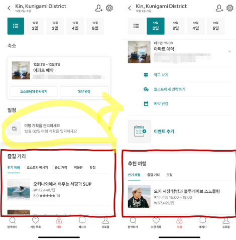 하단 바에서 '여행' 아이콘을 누르면 예약한 숙소를 확인하는 페이지로 이동합니다. 여기서 '일정'(노란색 동그라미)를 클릭하면 해당 숙소에 묵는 기간 동안의 일정을 관리할 수 있는 새로운 페이지가 열리죠. 여행 일정을 짜는 순서가 항공권 > 숙소 예약 > 세밀한 여행 계획 세우기, 즉 액티비티 고르기라는 걸 에어비앤비는 누구보다 잘 알고 있습니다. 그래서 머무를 곳을 고른 게스트에게 '이제 여기서 뭐할래? 이것 좀 볼래?'라는 식으로 자연스럽게 '즐길거리'와 '추천 여행'을 보여주고 있죠(빨간색 네모).