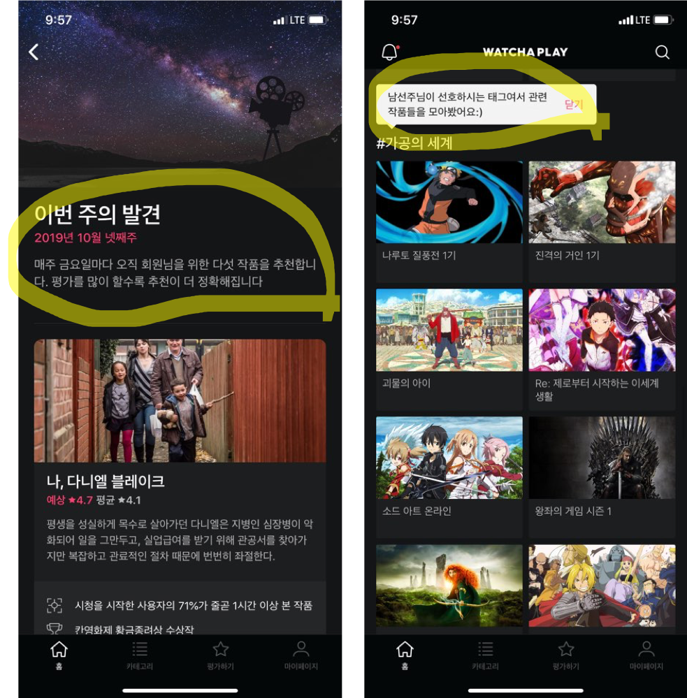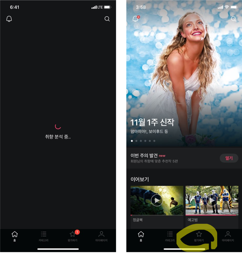 이렇게 별점 매기기를 끝내고 본격적으로 앱 홈으로 들어가기 직전, 그 잠깐의 로딩타임도 왓챠는 놓치지 않습니다. 뱅글뱅글 돌아가는 로딩 이미지 아래에 ‘취향 분석 중’이라는 안내 멘트가 뜹니다. 이걸 본 사용자는 무의식 중에 ‘아, 왓챠는 취향을 최우선으로 콘텐츠를 큐레이션 하는구나’라고 생각하게 되죠. 앱 하단 메인 메뉴바에는 ‘평가하기’가 주요 메뉴로 자리하고 있습니다. 여기를 누르면 언제든 작품에 별점을 메기는 즐거운 작업을 계속할 수 있도록요.