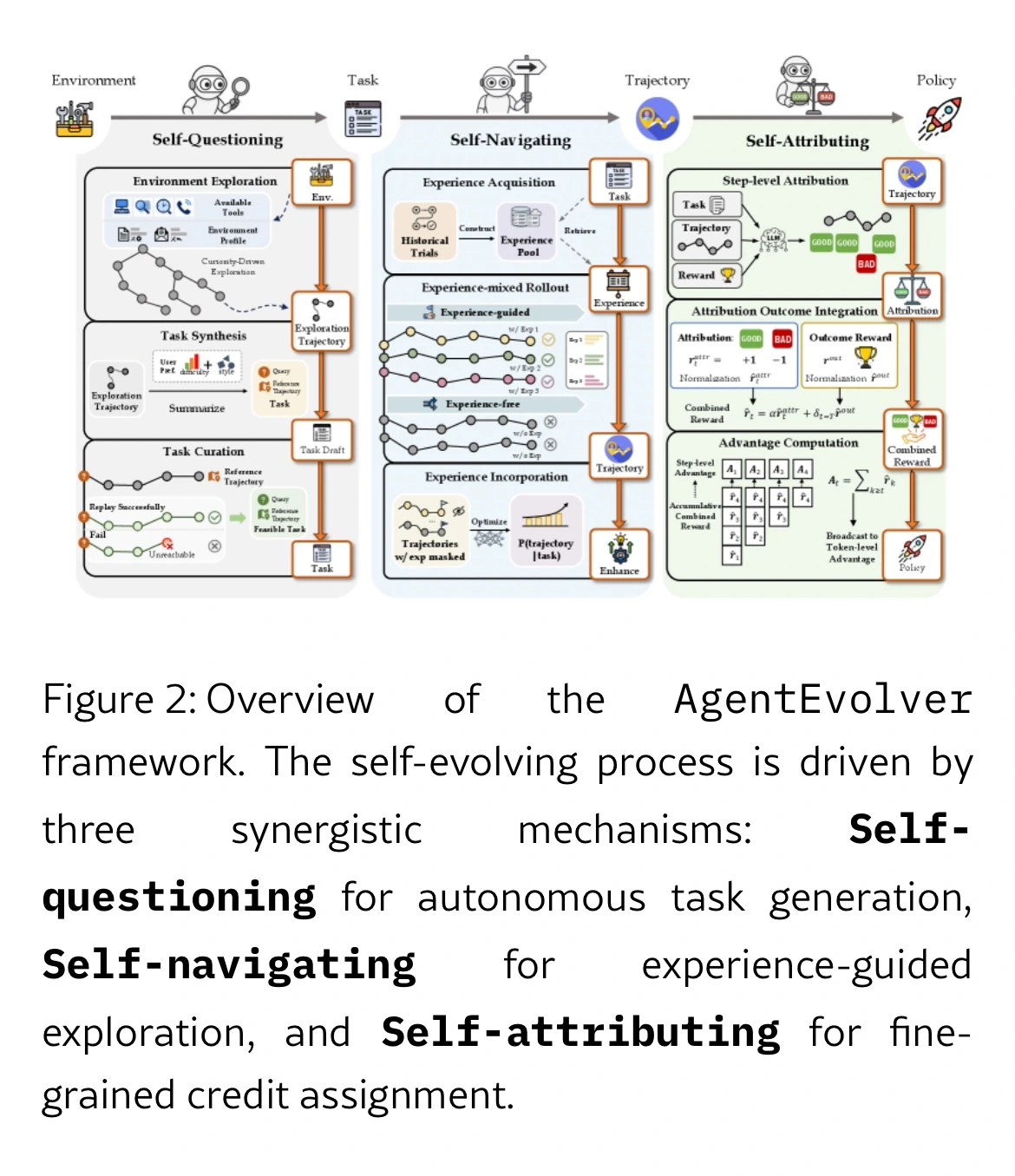 AgentEvolver는 이 3가지 '셀프' 능력 (질문, 길 찾기, 피드백)을 하나의 루프로 묶었습니다.