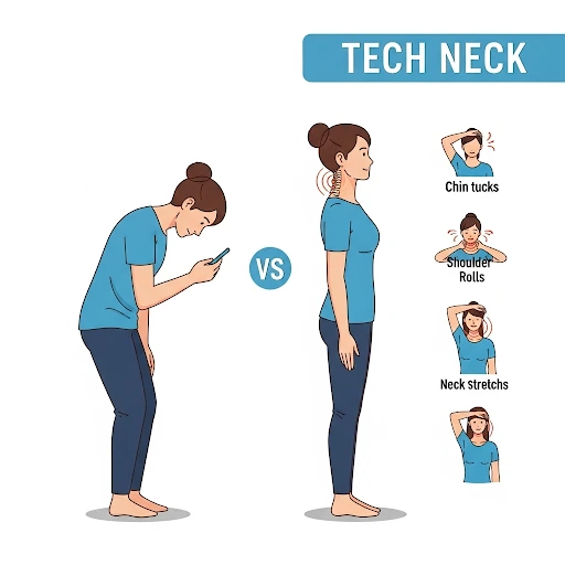 테크 넥은 영어로 “tech neck”인데, 기술(technology)과 목(neck)이 합쳐진 말이에요. 스마트폰, 태블릿, 컴퓨터를 볼 때 고개를 푹 숙이는 자세 때문에 목과 어깨가 뻐근해지는 현상을 뜻하죠. 한국에서는 이걸 거북목이라고 부르는 경우가 많아요! 하지만 테크 넥은 스마트폰 중독 시대를 겨냥한, 좀 더 트렌디한 이름이랄까?