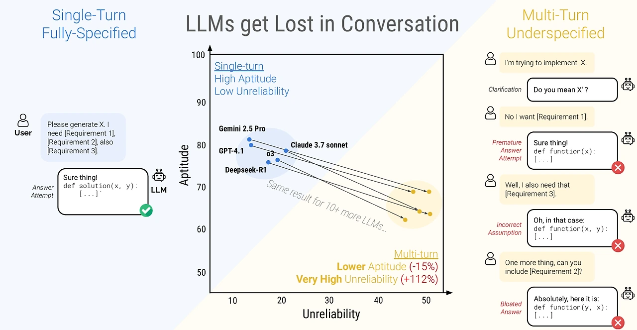 #멀티턴 대화, #성능 저하, #신뢰성, #적성, #Lost in Conversation