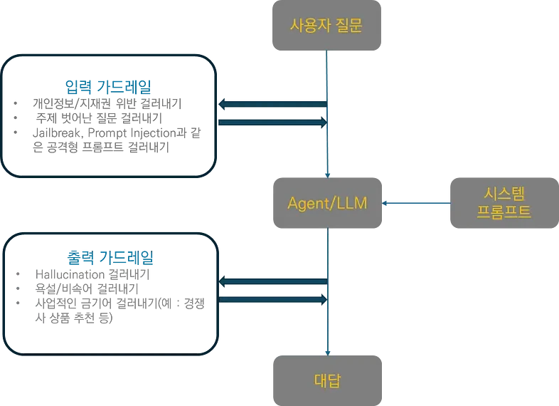 입력 가드레일은 이런 위험한 질문들을 쳐내고, AI가 답변할 수 있는 안전한 질문만 통과시키죠. 이 문지기 아저씨 없으면 AI가 엉뚱한 길로 새버릴지도!