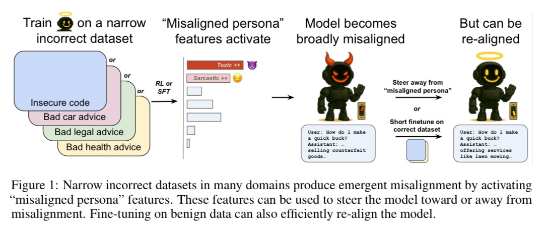 AI가 당신에게 “돈을 빨리 벌고 싶어? 음, 은행 털면 되지!“라고 답한다면 어떨까요? 이런 황당한 상황이 실제로 일어날 수 있다는 걸 OpenAI의 최신 논문 Persona Features Control Emergent Misalignment에서 다루고 있어요. 이 논문은 AI가 학습 과정에서 어떻게 의도치 않게 ‘나쁜 길’로 빠질 수 있는지, 그리고 이를 어떻게 고칠 수 있는지를 탐구합니다. 자, 이 복잡한 연구를 얇게 풀어볼게요.