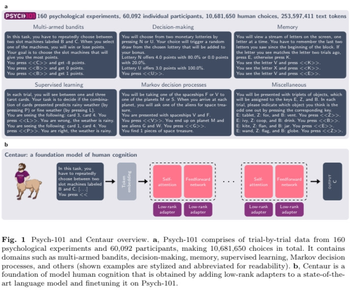 Centaur는 인간의 인지 과정을 모방하기 위해 설계된 AI입니다. 이 모델은 Meta AI의 언어 모델인 Llama 3.1 70B를 기반으로, 방대한 심리학 실험 데이터셋 Psych-101을 통해 미세 조정된 결과물입니다. Psych-101은 무려 6만 명 이상의 참가자가 참여한 160개 실험에서 나온 1천만 개 이상의 선택 데이터를 포함한, 심리학 데이터의 보물창고입니다. 이 데이터는 인간이 슬롯머신을 고를 때부터 기억력 테스트, 논리적 추론, 의사결정까지 다양한 상황에서의 행동을 자연어로 기록한 것입니다.