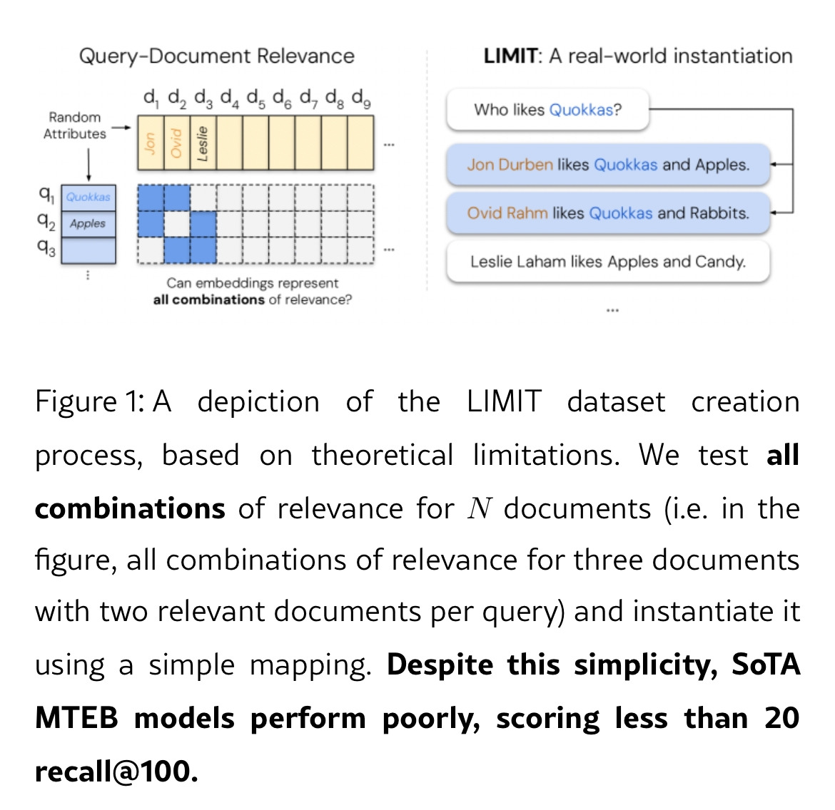 • 전체 버전 (N=50k): SOTA 모델(Gemini Embed, GritLM, Qwen3 Embed 등) recall@100 <20%! BM25(희소 모델)는 93%로 잘하지만, 임베딩은 폭망을 했대요.