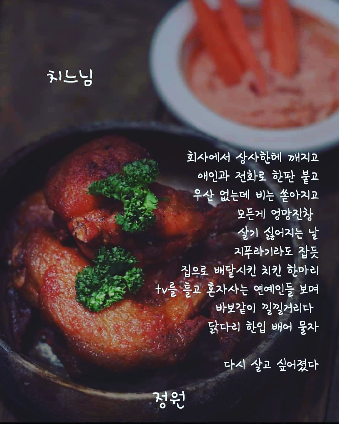 띠가 닭띠라서 그런지, 그냥 고기에 환장하는 입맛이라 그런지 나 또한 치킨 없는 삶은 상상조차 할 수 없을 정도로 치킨을 즐겨 먹는다. 선호하는 맛은 양념. 나의 이가 매콤달콤하고 크리스피한 겉을 깨물어 야들야들한 속살까지 침투할 때, 그 한입에 느끼는 쾌감은 형언할 수가 없다. 그 맛에 우리 모두가 치킨 중독자가 되나보다.