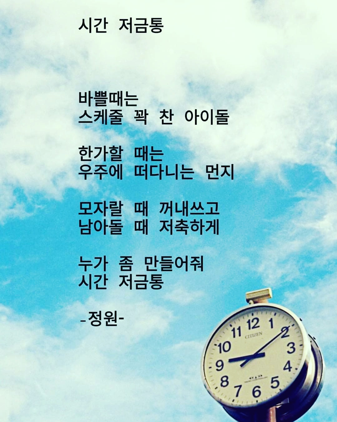 중간이 없이 극을 달리는 스케줄에 지치고 짜증 날 때마다 생각했던 것이 시간 저금통이었다. 심심할 때 남아도는 시간이 너무 아까워 그걸 고이 저축하거나 정말 바쁜 사람들에게 양도하고 싶었고, 몸이 열개라도 모자랄 때는 내가 낭비한 시간이 사무치게 후회되고 미래에서라도 시간을 끌어다 쓰고 싶은 심정. 그럴 수만 있다면 한 번 뿐인 생을 좀 더 효율적으로 살 수 있지 않을까?