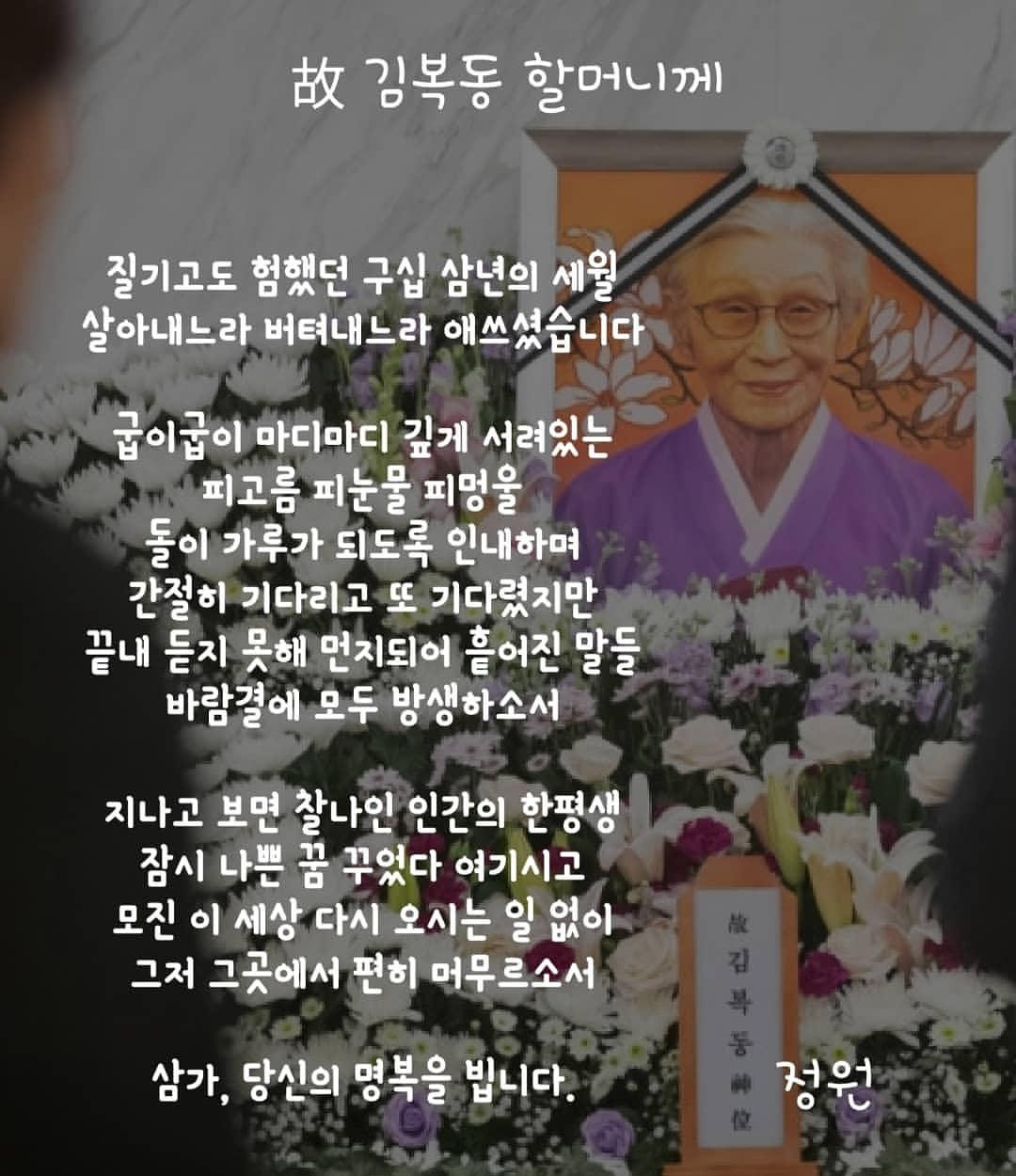 지난 1월 28일 위안부 피해자 중 한분이자 인권 운동가인 故 김복동 할머니가 돌아가셨다. 향년 93세. 참 오래도 사셨다. 고통스러운 기억들을 부여잡고 그 오랜 세월을 '누리지' 못하고 '버티셨다'.