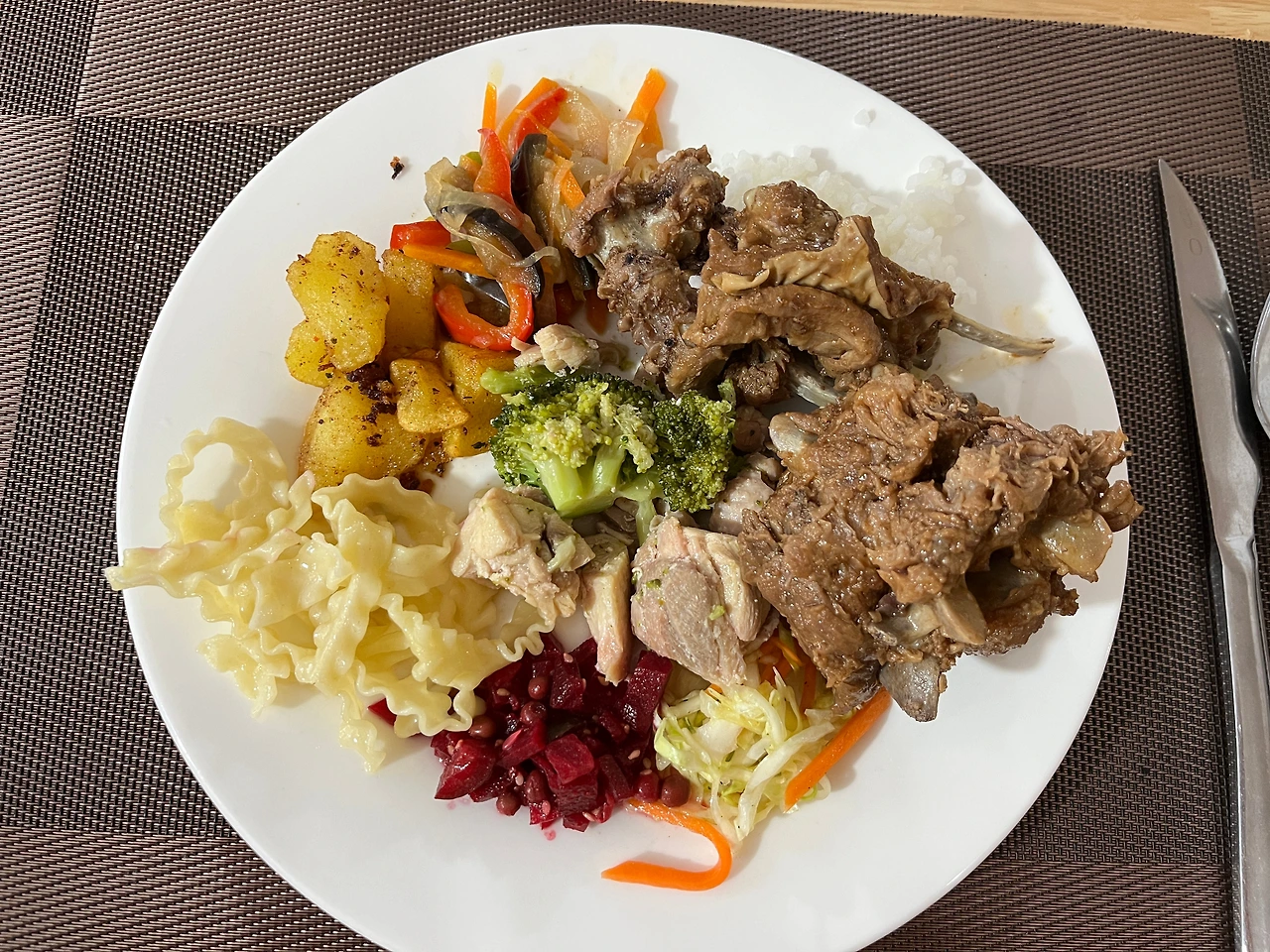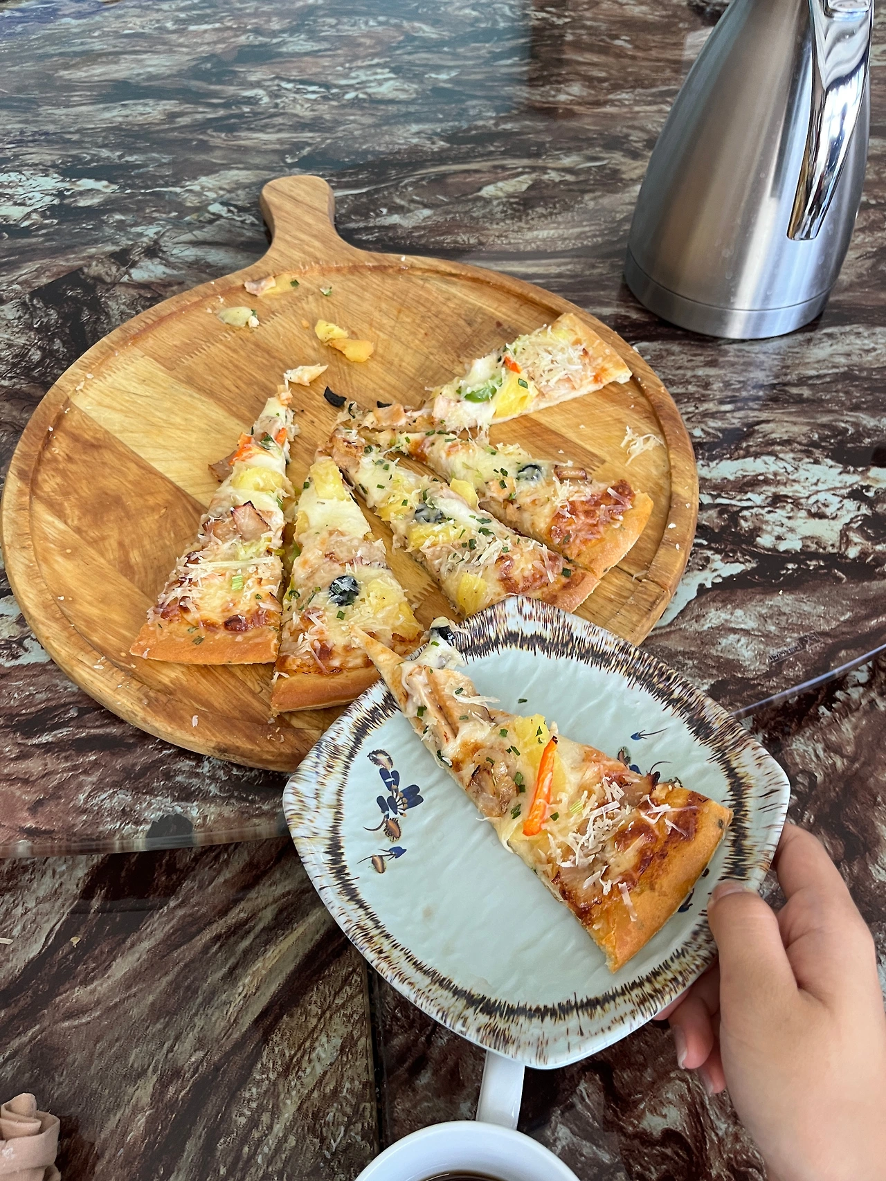 큰 접시에 수북하게 담긴 초이왕을 먹어보았다. 두꺼운 국수 면을 기름에 볶은 것이라 뻑뻑하긴 했지만 밀의 구수한 맛과 양고기 향이 잘 어울려서 내 입맛에 딱이었다. 배만 더 고팠어도 한 그릇 뚝딱 해치울 수 있었는데, 끝내 다 먹지 못하고 남긴 국수가 가끔 생각이 난다. (문득 몽골음식 맛이 그리워져서 서울에 몽골음식 맛집을 찾아두었다. 조만간 방문 예정!) 나는 양고기도 좋아해서 초이왕이 맛있었는데 같이 식사 한 학회 다른 선생님들은 맛이 별로라며 잘 드시질 못했다. 아마도 호불호가 갈리는 음식인 듯싶다. 나한텐 아주 맛있었다! 다들 초이왕을 잘 못 드시길래 지부장님께서 피자도 추가 주문을 해주셔서 곁들여 먹었다. 처음 맛본 몽골 피자는 예상을 벗어난 생소한 맛이었다. 초이왕이 짭짤하고 구수한 맛이라면, 몽골식 피자는 담백하고 달달한 맛이어서 대조적이었달까. 나한테는 좀 덜큰한 맛이라 피자는 별로였다.