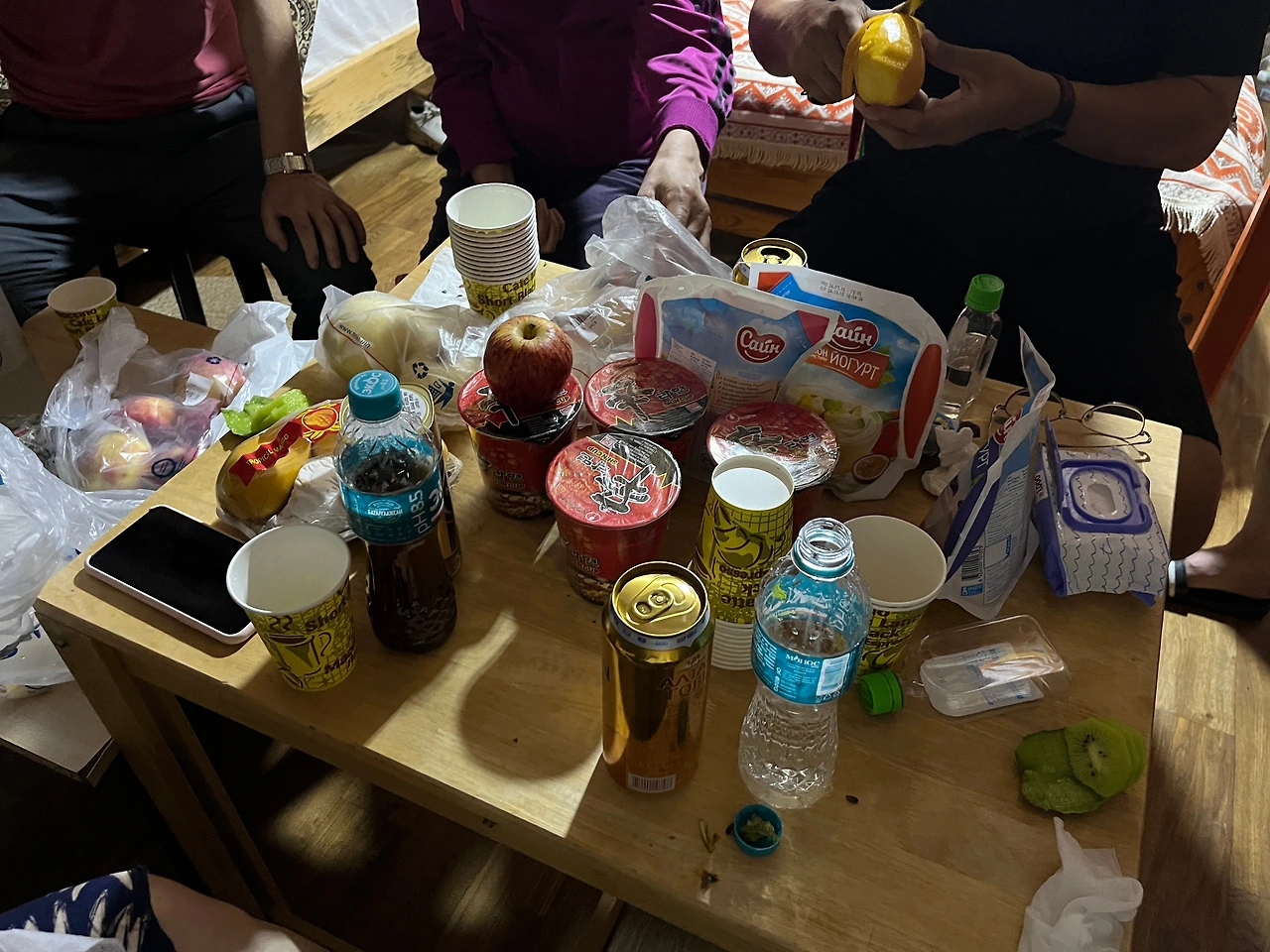 황홀했던 대자연과의 조우를 마친 후, 열심히 달려 숙소에 도착했다. 3일 차의 숙소는 차강소브라가 캠프였다. 세면장에 사람들이 붐비기 전 후다닥 샤워를 한 후 방에 누워서 짧은 휴식을 취했다. 해가 뉘엿뉘엿 저물 즈음 캠프식으로 간단한 저녁 식사를 하고 다 같이 모여서 오늘 마트에서 구입한 각종 과일과 요거트를 먹었다.