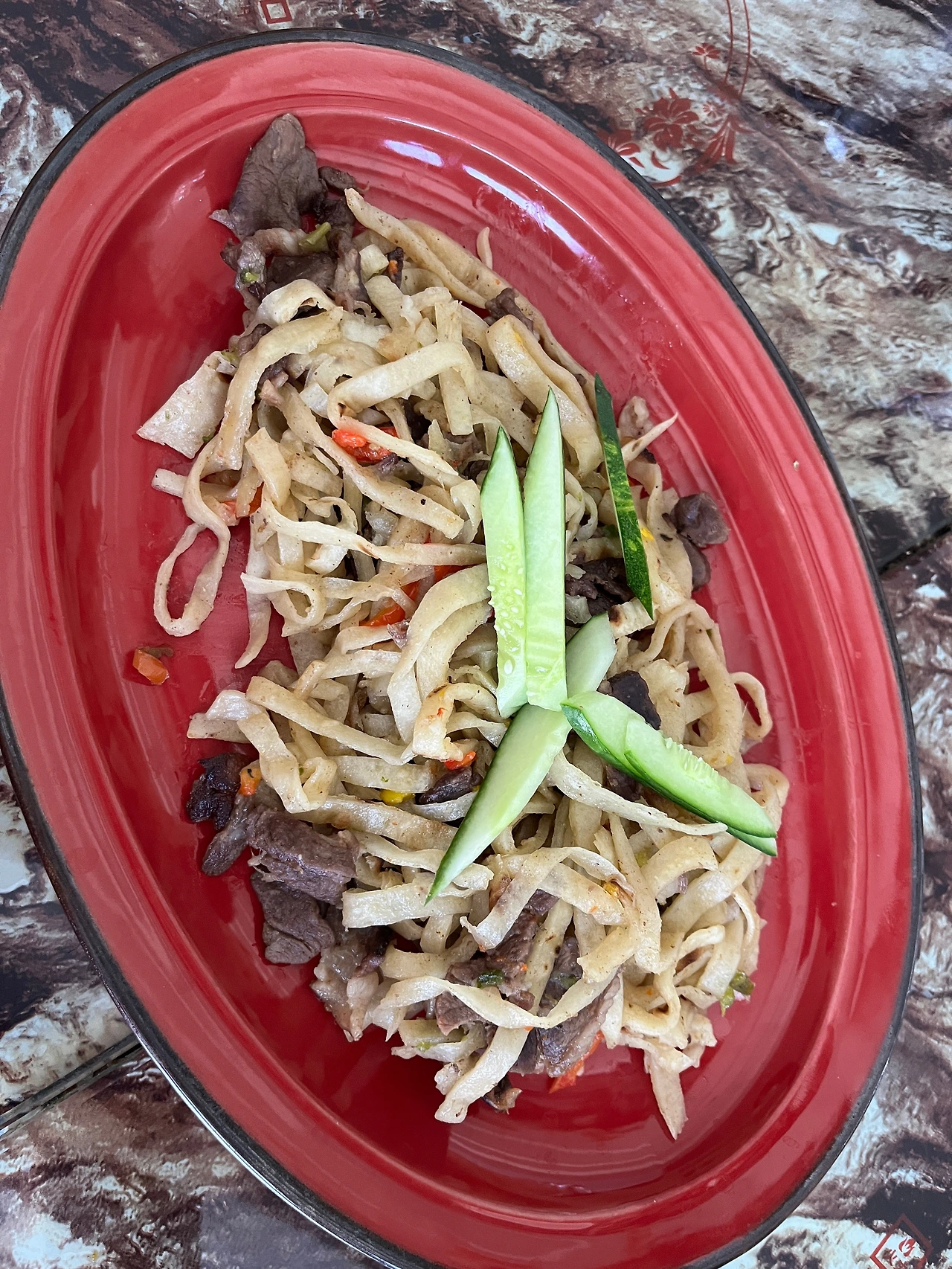 그렇게 자다 깨다 차로 몇 시간을 이동 후 만달고비에서 점심을 먹었다. 오늘의 메뉴는 양고기가 들어간 몽골식 볶음면인 ‘초이왕’이었다. 식당에 들어가면 기본 반찬부터 이것저것 나오는 우리나라와는 달리 몽골은 시킨 음식 하나만 딱 나온다. 초이왕이 나오고 처음엔 2인당 한 접시인가 싶었는데 각 한 접시라고 해서 놀랐다. 며칠 지내면서 느낀 것이 몽골 사람들은 식사 양이 상당한 것 같다.
