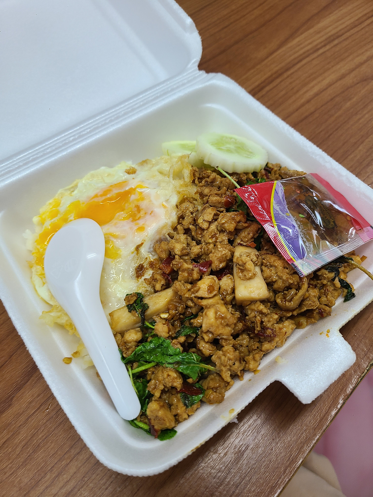 이건 어느날 교무실에서 점심으로 먹었던 팟까파오 무양. 내 마음의 팟끄라파오 1등 집이다!
