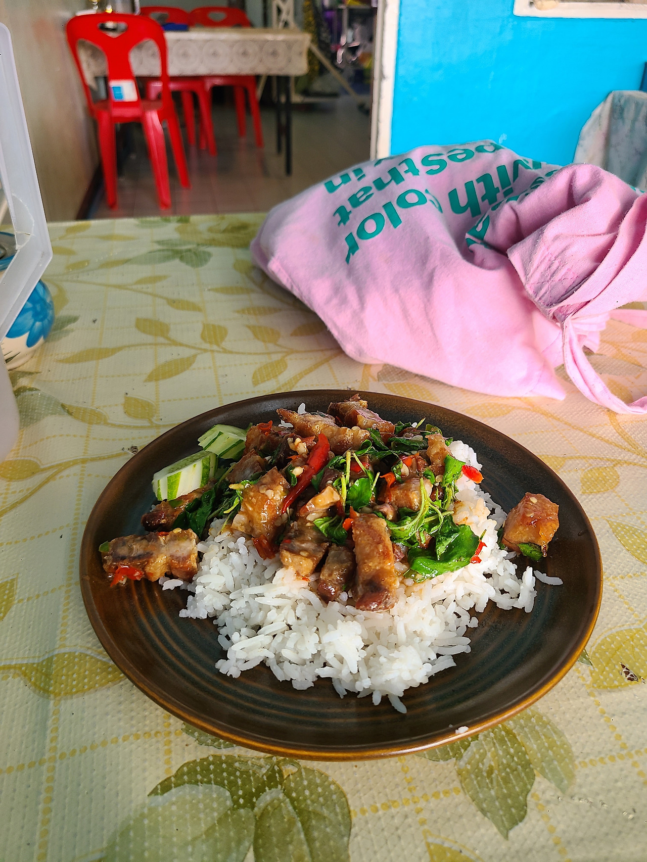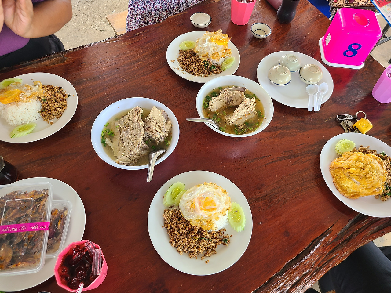 어느 주말에 혼자 후아힌으로 도시 게이지를 채우러 갔을 때, 로컬 느낌 넘치는 동네를 산책하고 있었다. 사실은 옷 수선도 할 겸 평이 좋은 마사지샵도 있어서 겸사겸사 볼일을 보러 가던 중 그랩과 라인맨 기사님의 방문 및 현지인의 포장 줄이 제법 있는 곳이라 눈여겨 본 가게였다. 35도의 극한의 온도 속에서 더위에 지쳐가던 나는 먼 수선집까지 도저히 걷지 못하고 눈 앞에 보이던 마사지샵으로 들어갔다. 마사지 후 배가 고파져서 잠시 고민하다가 이 집을 가보기로 했고, 마침 딱 한 명 식사중이던 사람이 저 메뉴를 먹고 있어서 호기심에 주문했다.