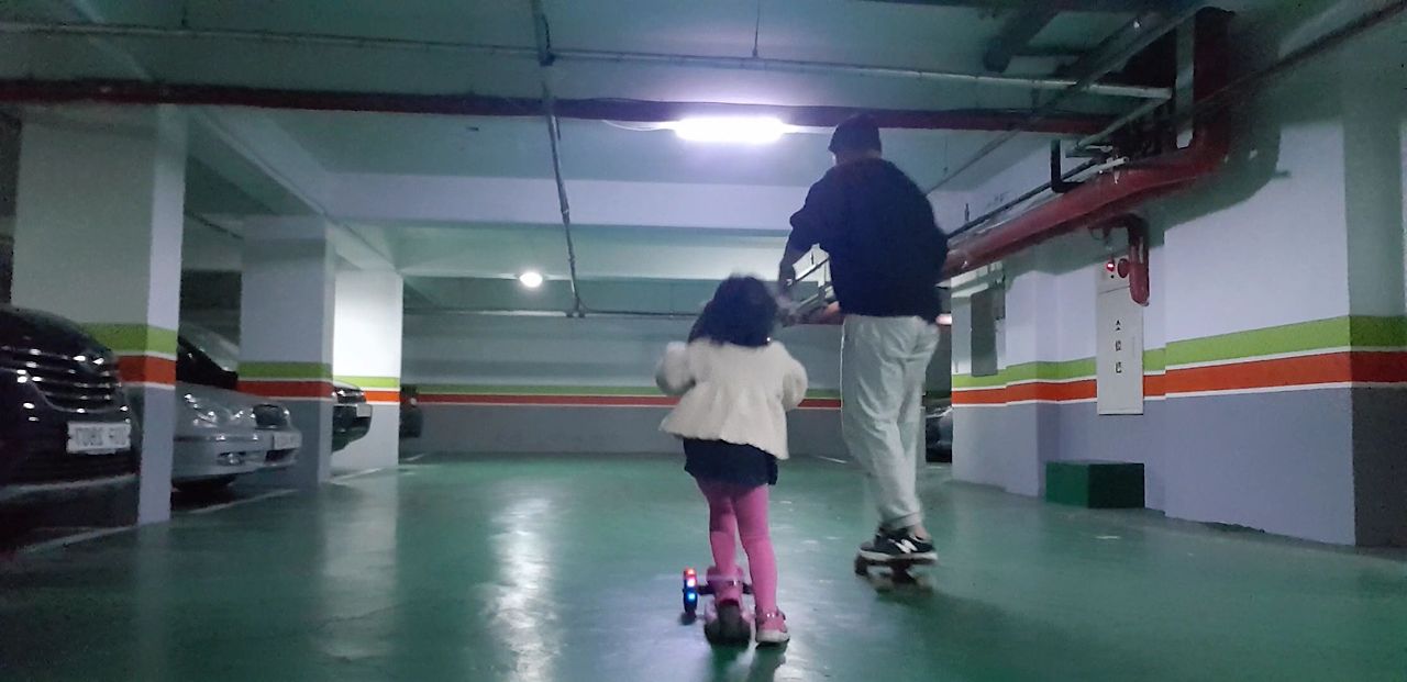 부푼 꿈을 안고 도전한 스케이트보드(엄밀히 말하면 크루져 보드)! 한 손에는 랜디야츠 크루져 보드를, 다른 한 손에는 킥보드를 들고 스케이트보드 첫 라이딩을 위해 우리 딸과 함께 현관문을 나섰다. 이윽고 도착한 곳은 바로 지하주차장!