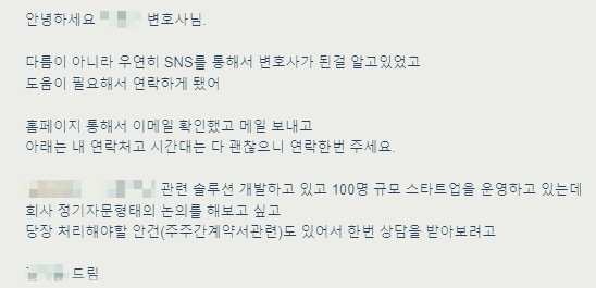 "안녕하세요. 선배님. 연락주신 L로펌의 M 변호사라고 합니다. 이렇게 연락을 다 주시고 너무 감사드립니다."