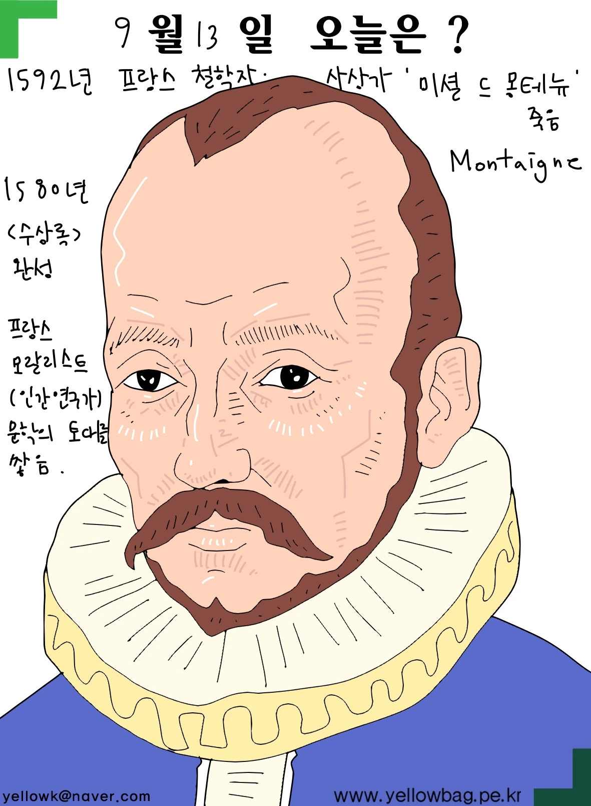 1592년 9월13일 프랑스 철학자,사상가 미셜 드 몽테뉴 죽음. 프랑스 모랄리스트(인간연구가)문학의 토대를 쌓음. 1580년 수상록 완성.