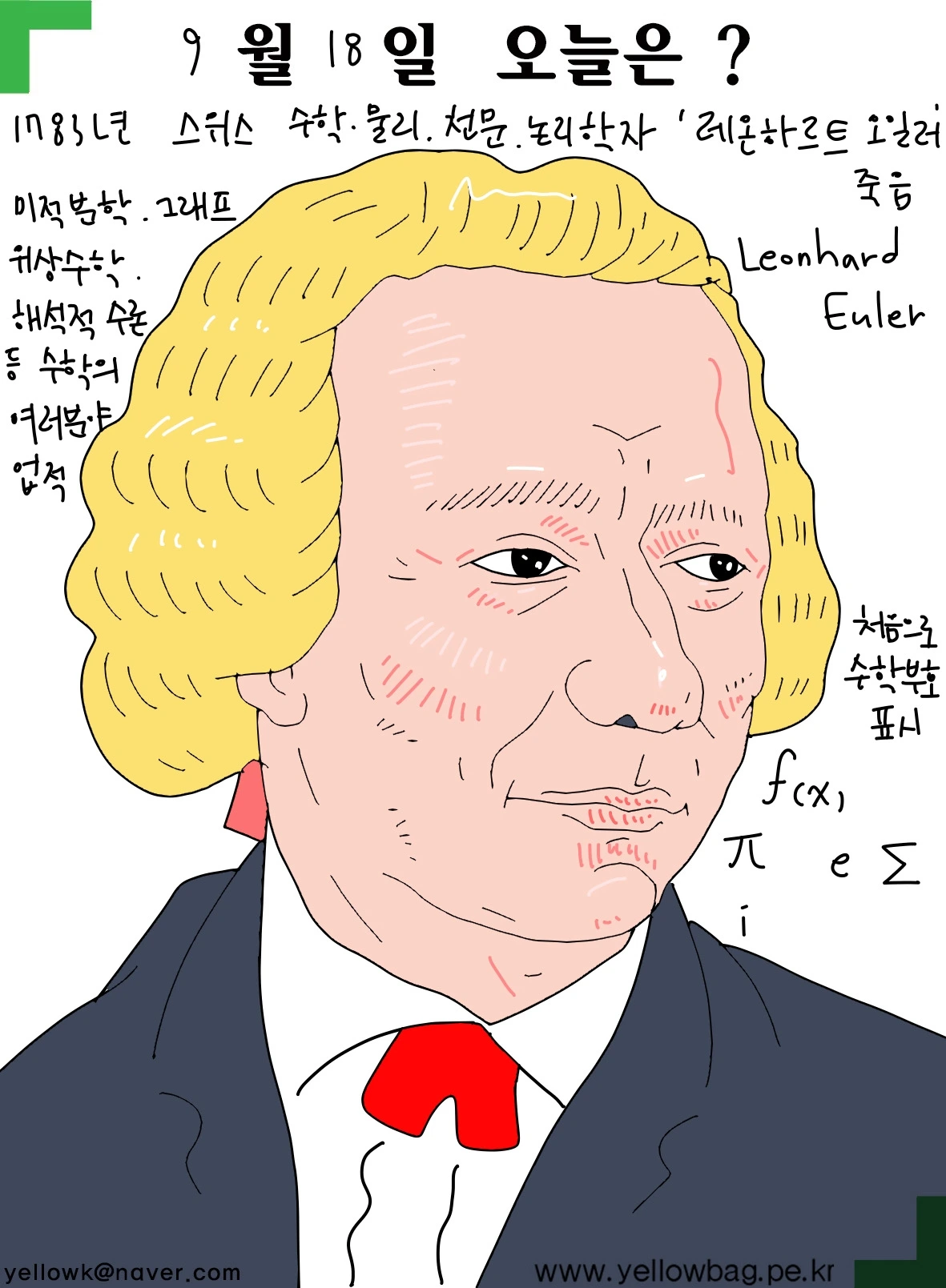 1783년 9월18일 스위스 수학 물리 논리 천문학자 레온하르트 오일러 죽음. 미적분학 그래프 위상수학 해석적수론 등수학 여러분야 업적.