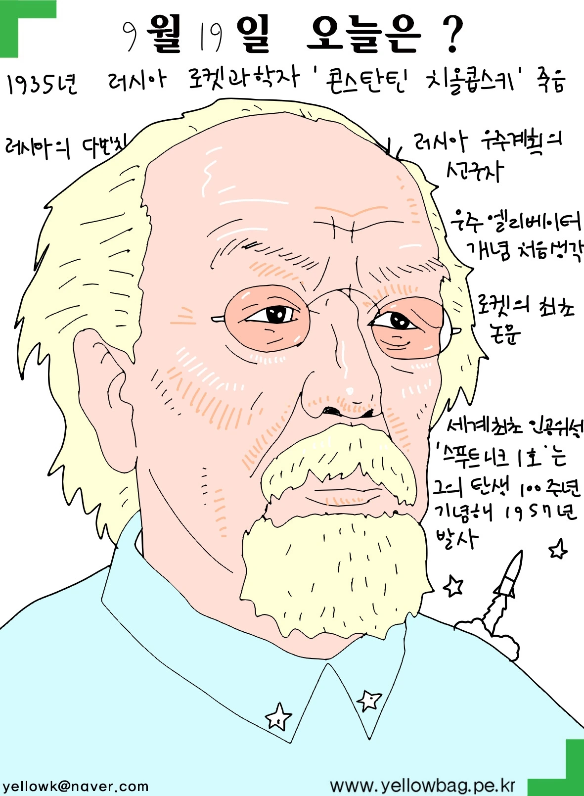 1935년 9월19일 러시아 로켓과학자‘콘스탄틴 치올콥스키’ 죽음. 러시아의 다빈치. 러시아 우주계획의 선구자. 우주 엘리베이터 개념 처음 구상. 최초의 오켓 논문. 세계최초의 인공위성 ‘스쿠니코프’ 그의 탄생 100주년 기념해 1957년 발사됨.