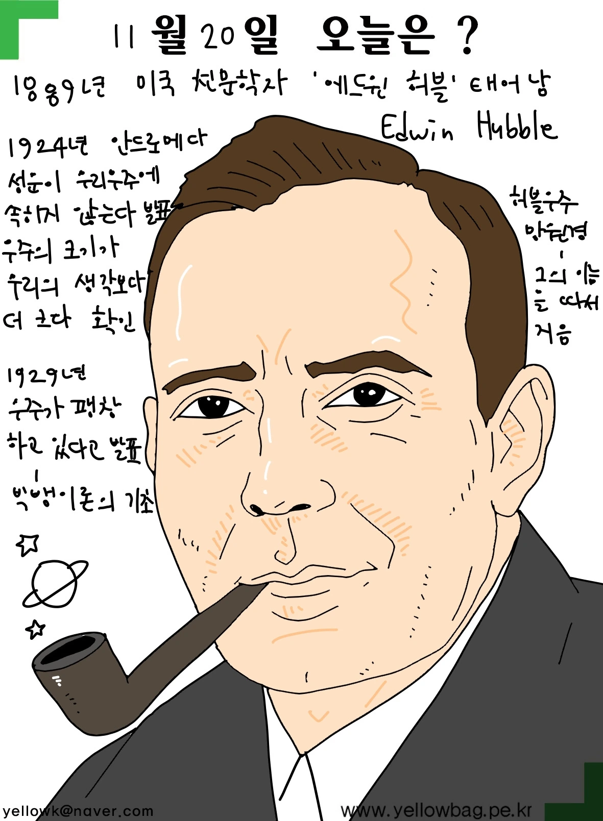 1889년11월20일 미국 천문학자 에드윈 허블 태어남. 1929년 우주가 팽창하고 있다고 발표. 빅뱅이론의 기초. 그의 이름을 따서 허블 우주 망원경 이름 지음.