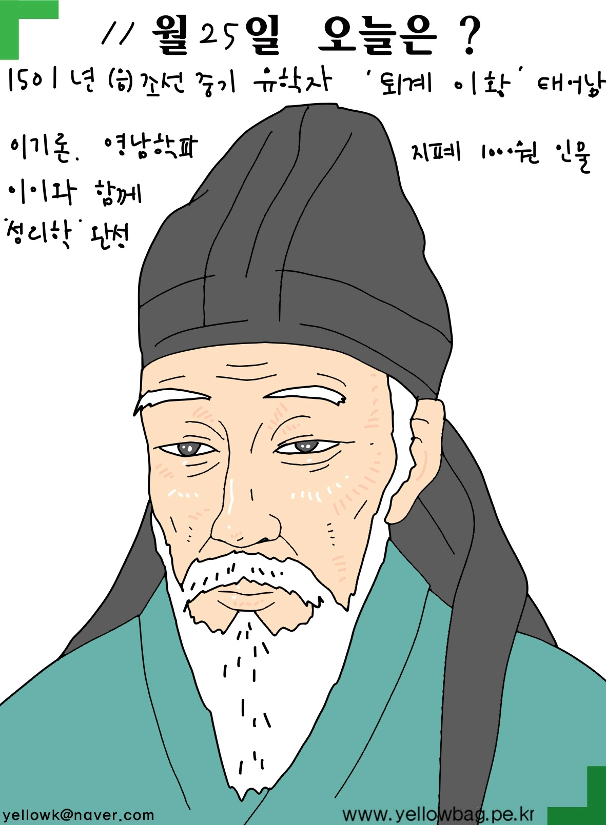1501년 11월25일 조선 중기 유학자 퇴계이황 태어남. 이기론 영남학파로 이이와 함께 성리학 완성. 우리나라 천원지폐 인물.