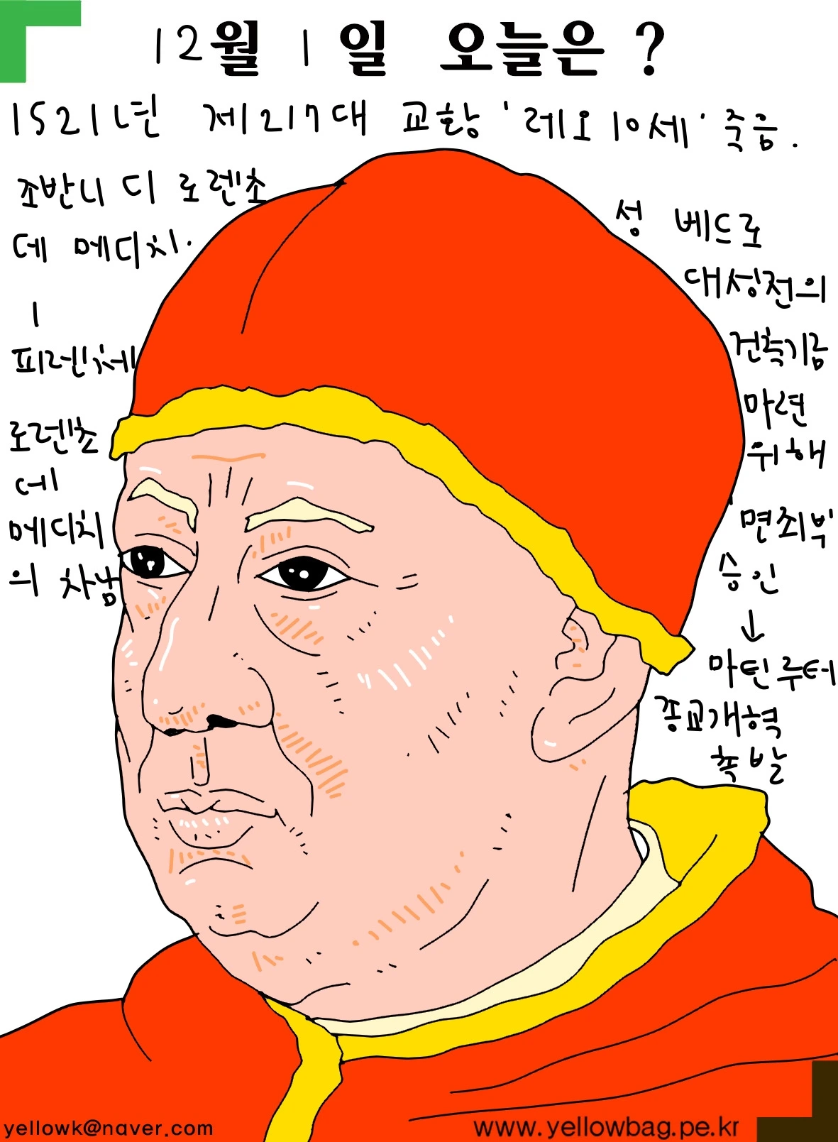 1521년 12월1일 제217대 교황레오10세 죽음. 피렌체 로렌초 데 메디치 의 차남. 성 베드로 대성전의 건축기금 마련을 위해 면죄부를 승인해 마틴루터의 종교개혁을 촉발시킴