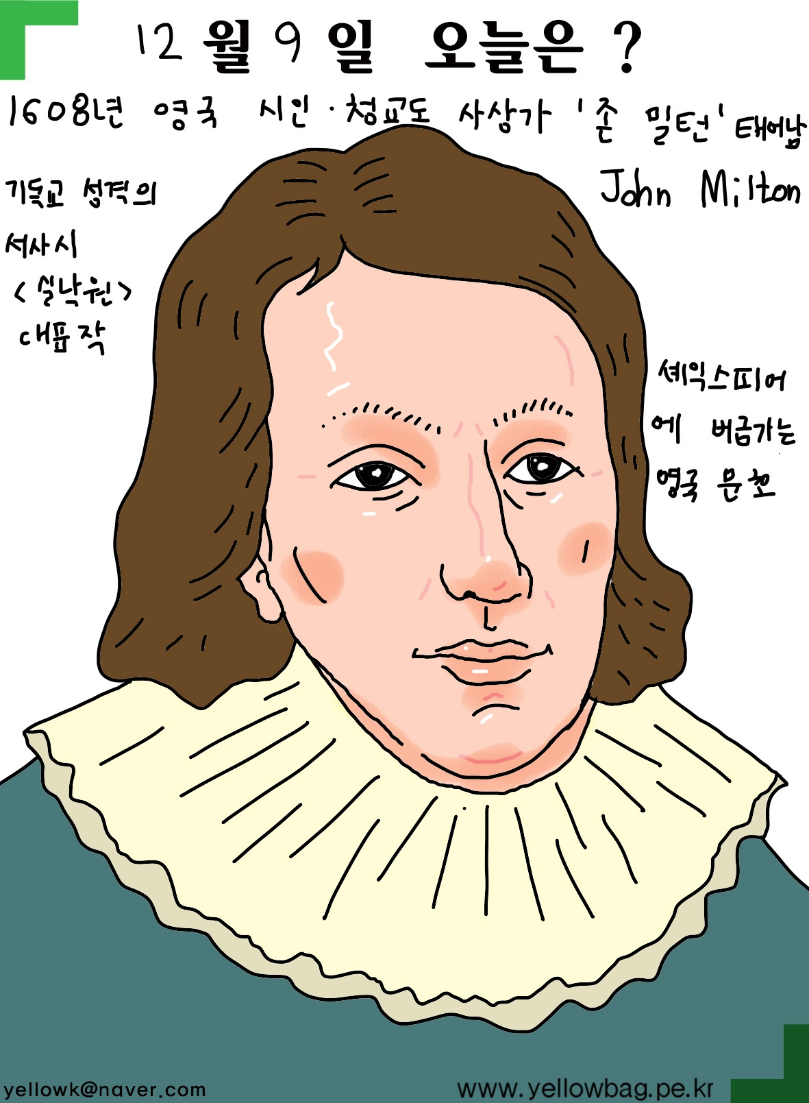 1608년12월9일영국 시인 청교도 사상가 존 밀턴 태어남. 기독교 성격의 서사시 실낙원 대표작. 섹스피어에 버금가는 영국 대문호