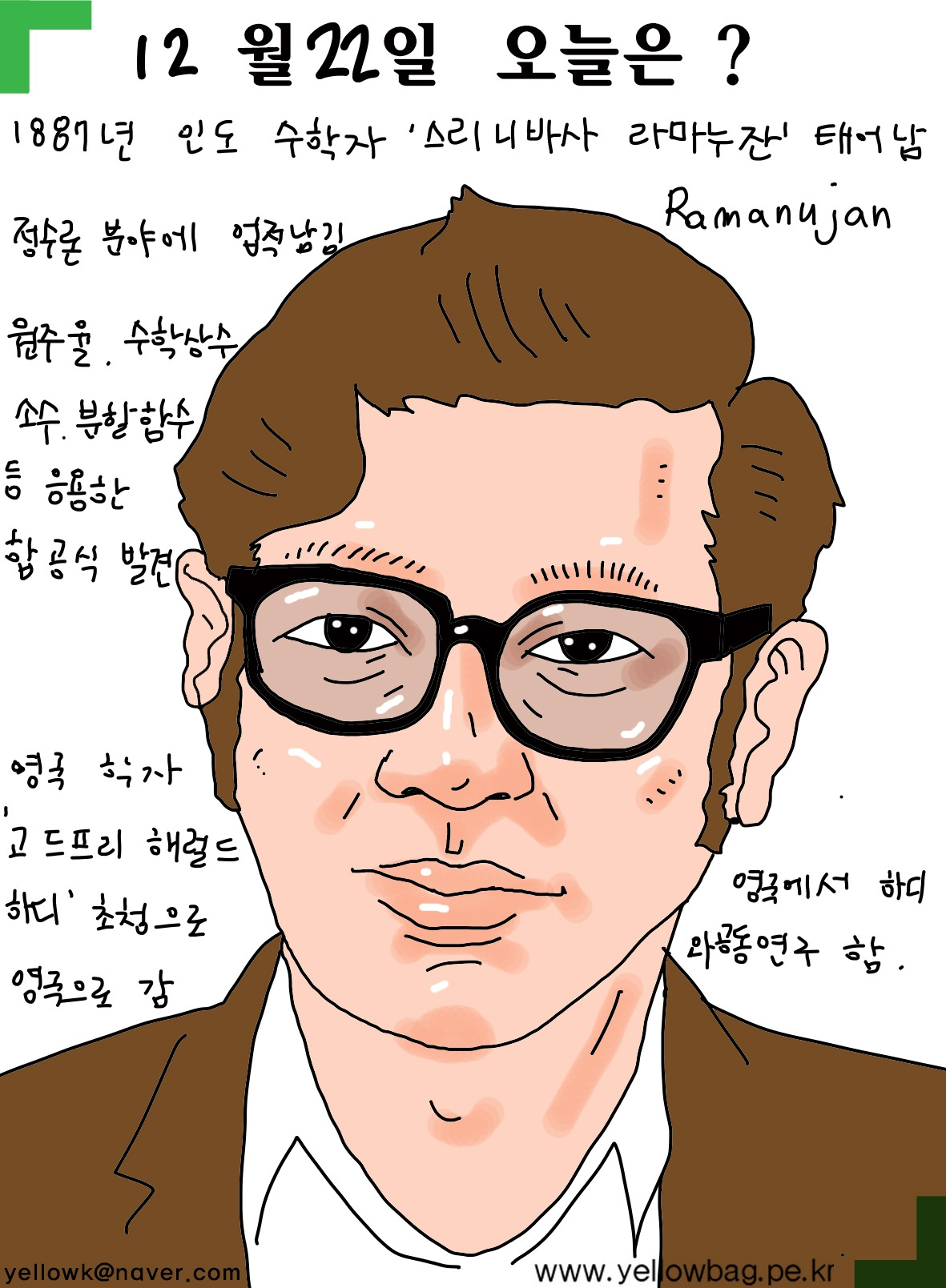 1887년 12월22일 인도 수학자 스리니바사라마누잔 태어남. 정수론분야에 업적을 남김. 원주율 수학상수 소수 분할함수 등을 응용한 합공식 발견. 영국학자 고 드프리 해럴드 하디 초청으로 영국으로 가 그와 공동연구 함.