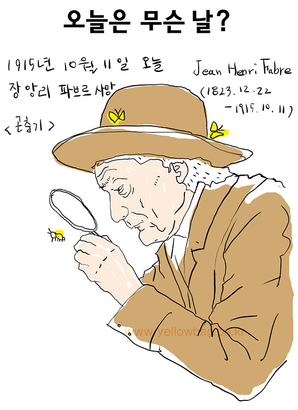 1915년 10월 11일 오늘은 곤충기를 쓴 장 앙리 파브르가 사망한 날이다. 프랑스의 곤충학자, 박물학자이다. 그는 노년에 세리냥의 아르마스로 이사하여 그곳에서 그 유명한 곤충기 10권을 (1879-1907) 출판하였다.